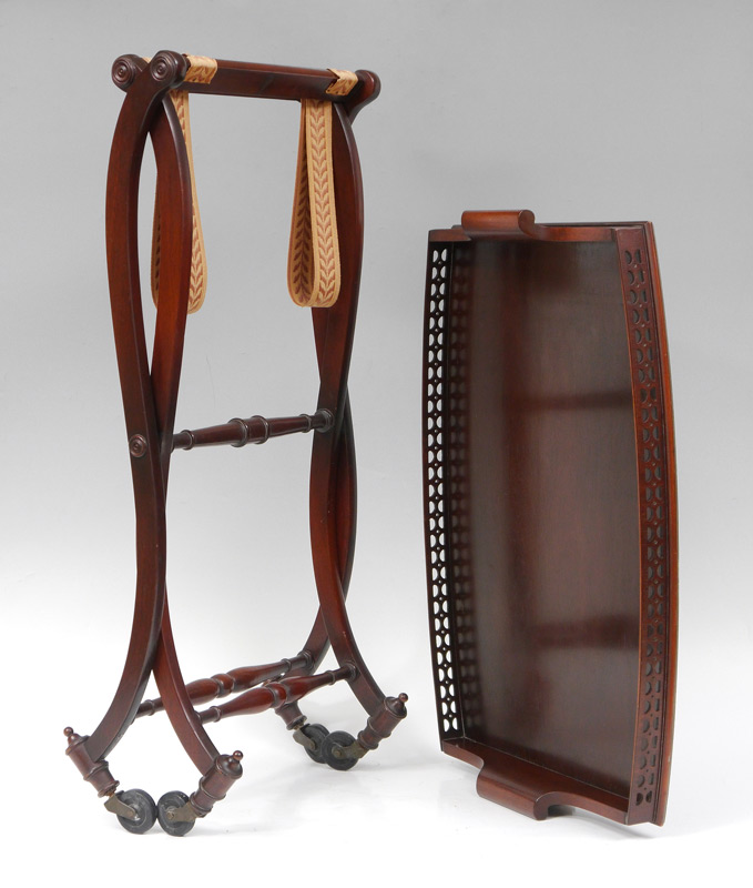 MAHOGANY TEA TRAY TABLE: Lift off tray, folding base on castors. Overall 27 1/2'' h. x 27 1/4'' x 18''.