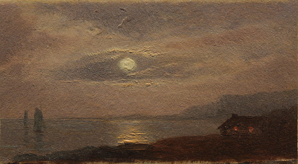 HART, William M., (American, 1823-1894): Coastal Scene with Ships by Moon Light, Oil/Canvas, mounted to Board, 2'' x 3 1/2'', inscribed verso, unframed.