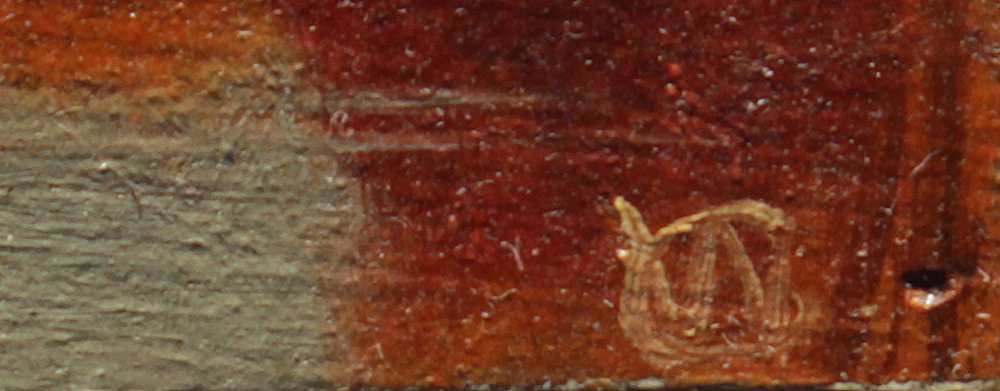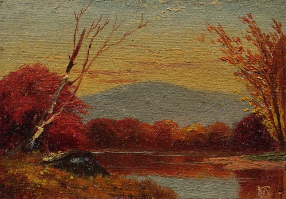 AMERICAN SCHOOL AUTUMNAL MINIATURE RIVER LANDSCAPE PAINTING: Oil/Canvas mounted to Card, overall measurement 7'' x 8 1/4'', image size is 3 3/4'' x 4 7/8'', monogrammed CW? lower right, unframed. From the same collection as all of the William Hart Sketches.