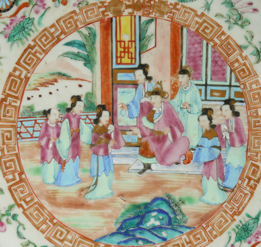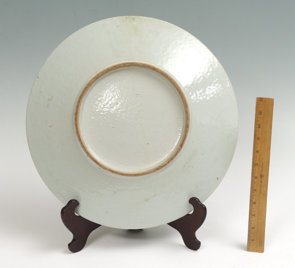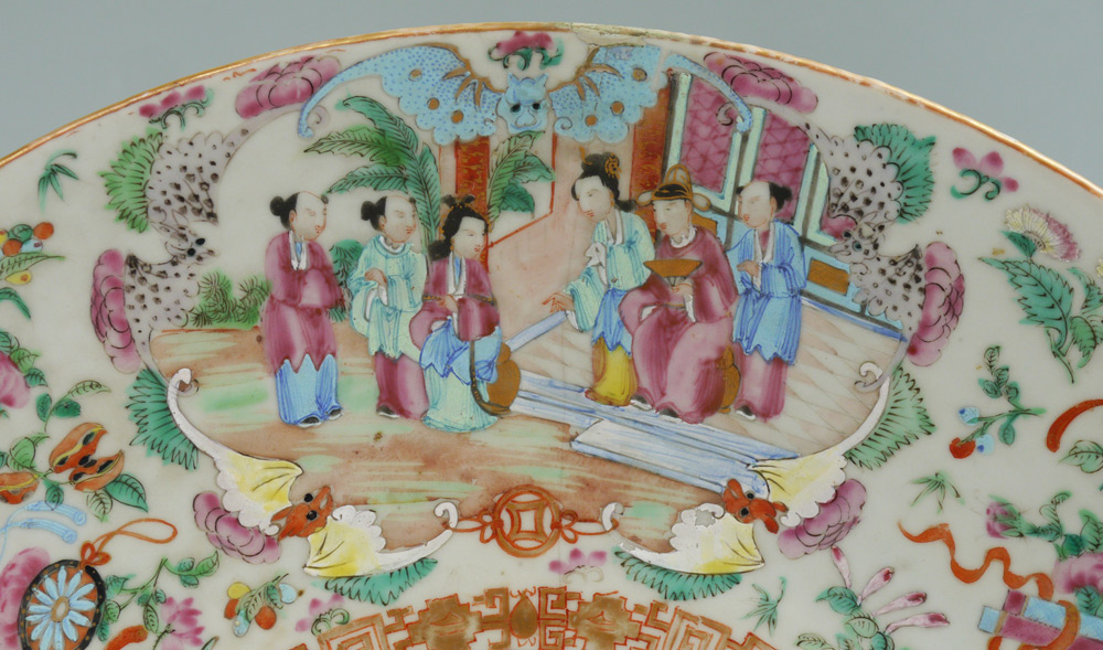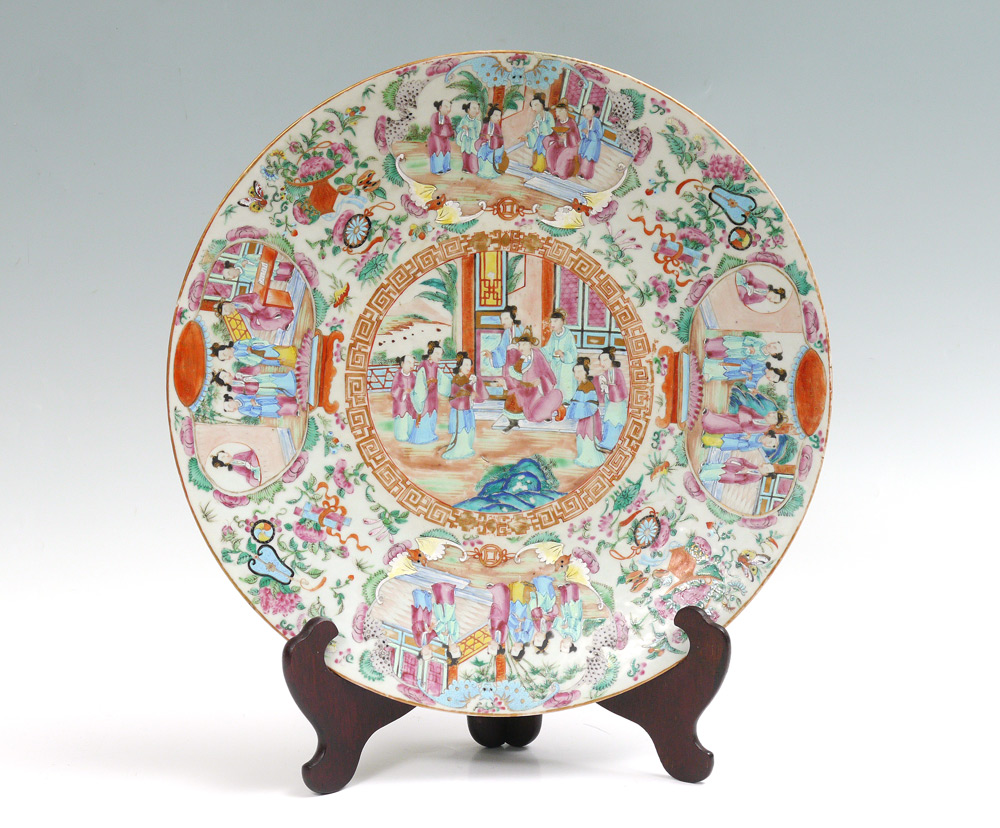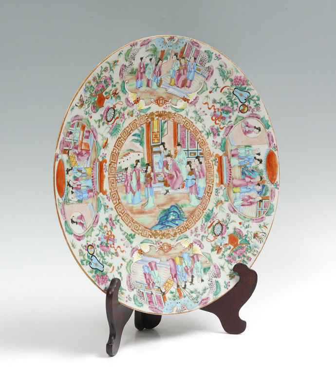ORIENTAL ROSE MEDALLION CHARGER: Floral decorated with outdoor genre scenes in reserves. Unmarked, 16 1/2'' dia.