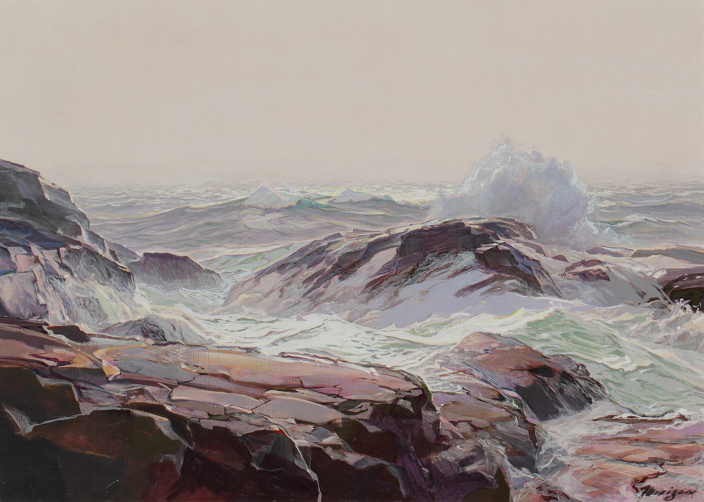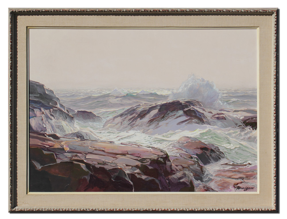 MERIZON, Armand, (American, 1920-2010): Crashing Surf on Coastal Rocks, Oil/Board, 30 1/2'' x 42 1/4'', signed lower right, encased in original carved and painted frame with wear 37'' x 50''.