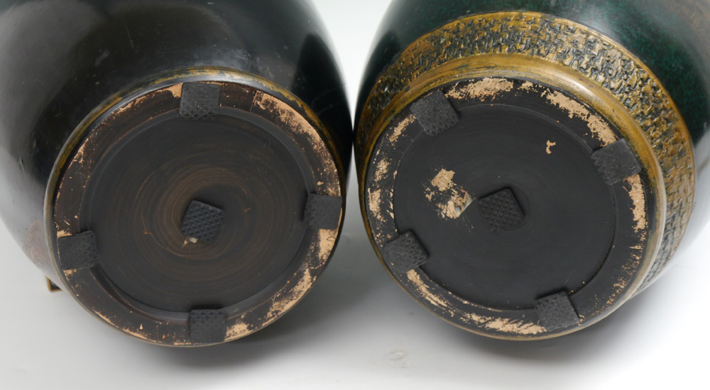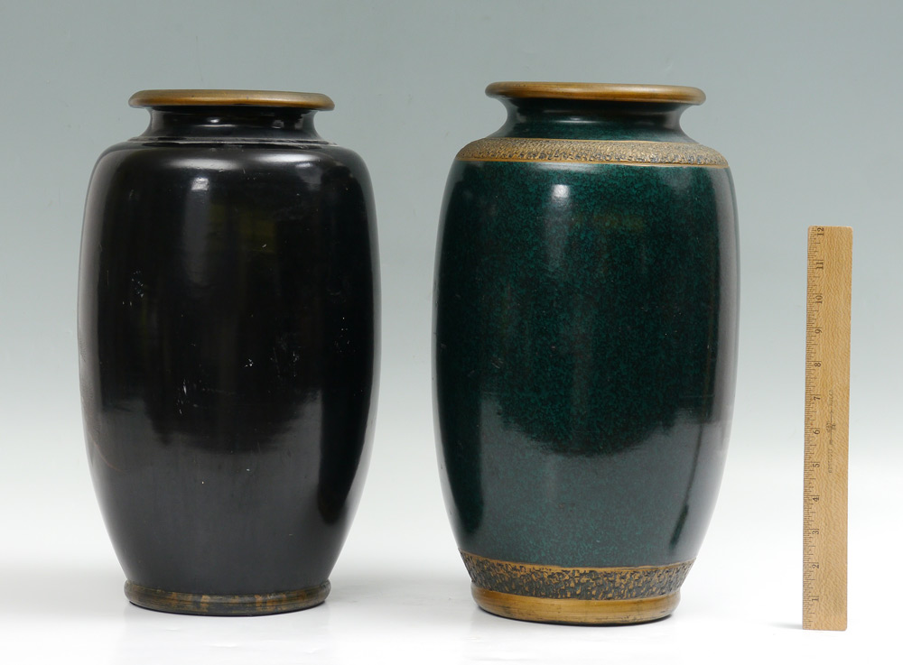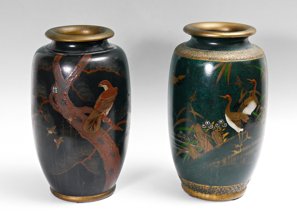 2 PIECE ORIENTAL HAND PAINTED VASES: Hand painted over earthenware to include 1) Black ground with bird of prey on branches, 15 3/4'' h. x 9''. 2) Green ground with cranes in wetlands, 16 1/4'' h. x 9''.