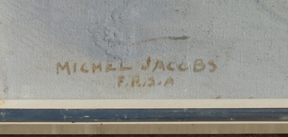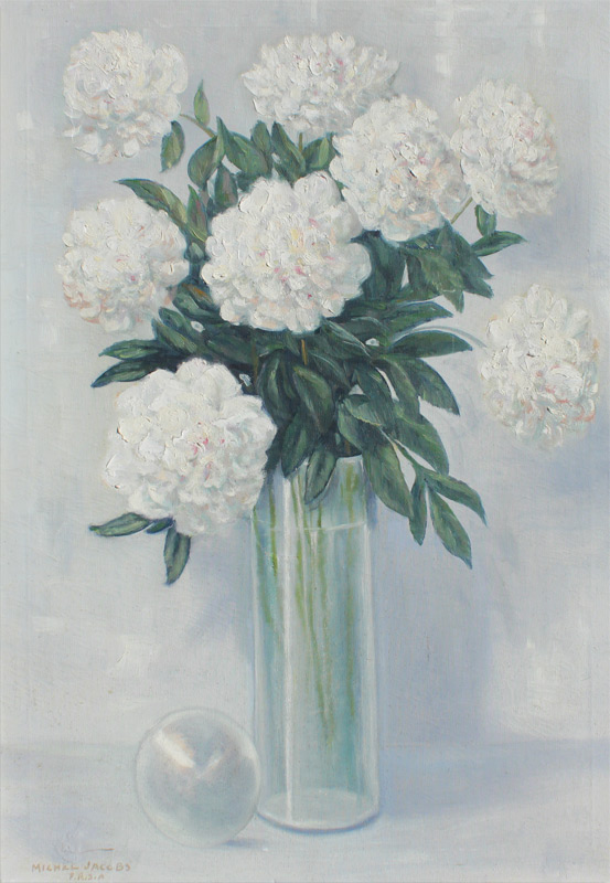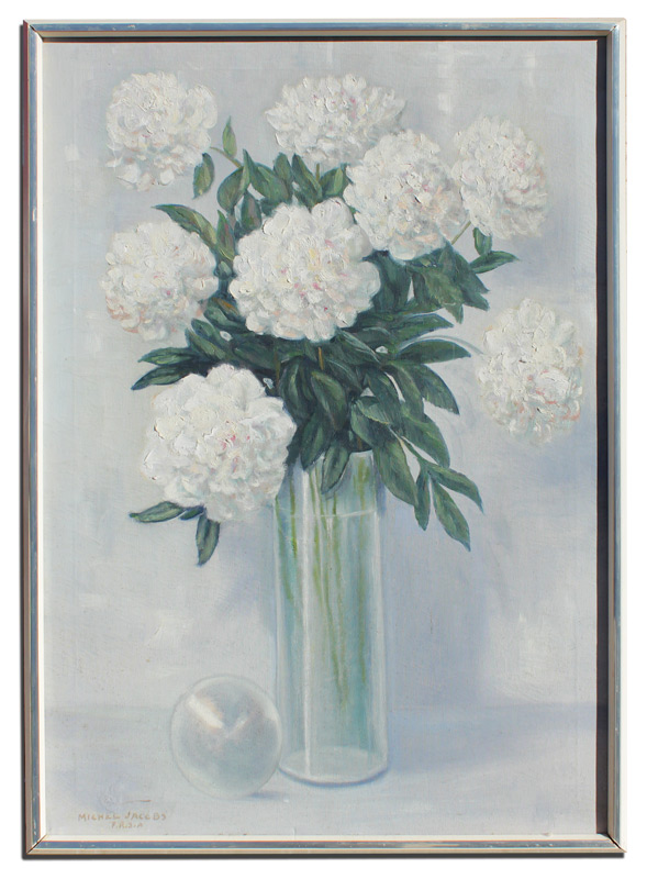 JACOBS, Michel, (American, 1877-1958): Still Life of Carnations in a Glass Vase, Oil/Canvas, 34 1/4'' x 24'', signed lower left with some designation initials illegibly marked beneath the signature, encased in a painted white frame with metal accent showing signs of wear 35 1/2'' x 25 1/4''.
