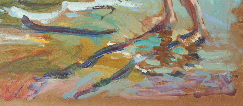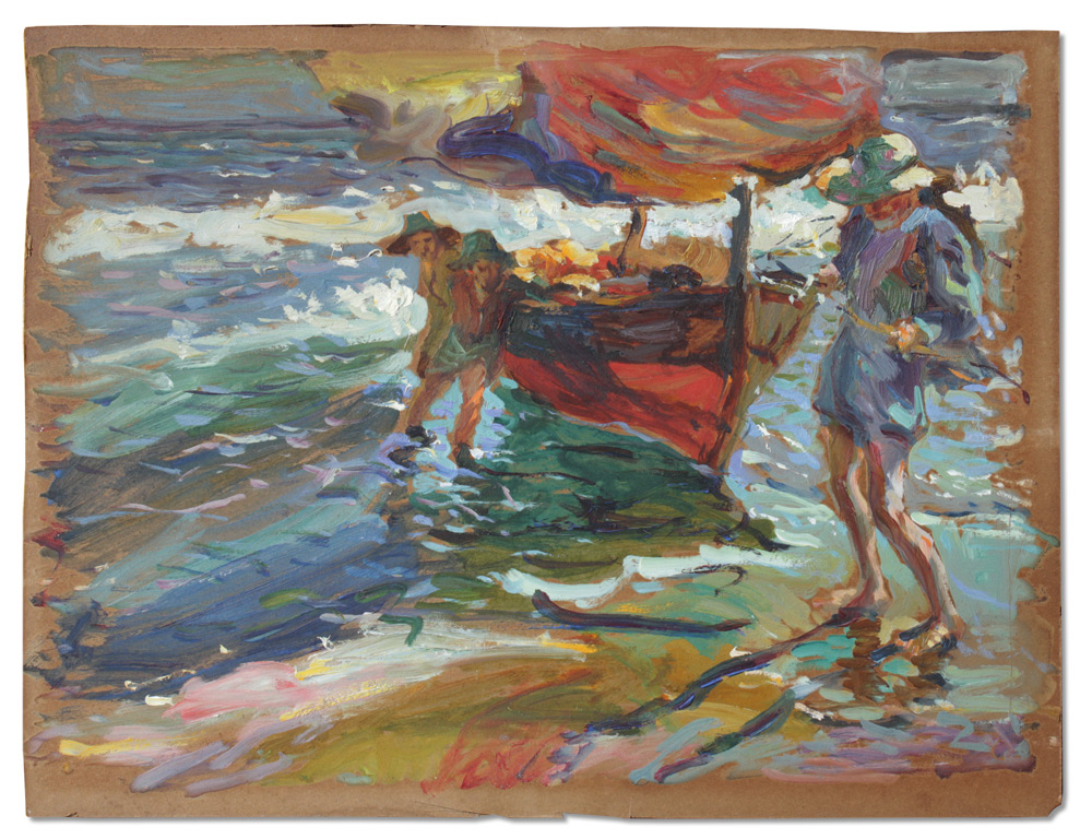 BEACH PAINTING CIRCA 1920 IN THE STYLE OF SOROLLA: Oil/Watercolor on Cardboard, 9 1/2'' x 12 1/4'', no visible signature, encased in period painted oak frame 14 1/2'' x 17 5/8''.