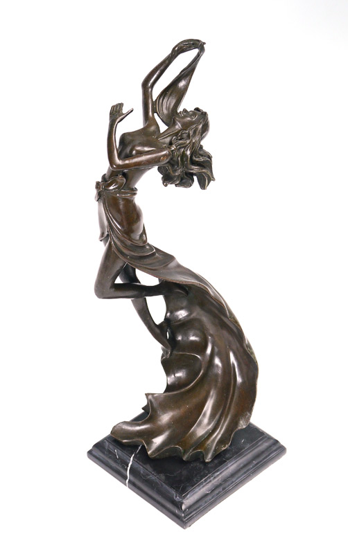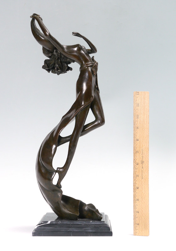 DECO BRONZE NUDE SCULPTURE: Young girl wrapped in leaf, 17 1/2'' h., affixed to beveled marble plinth, unsigned.