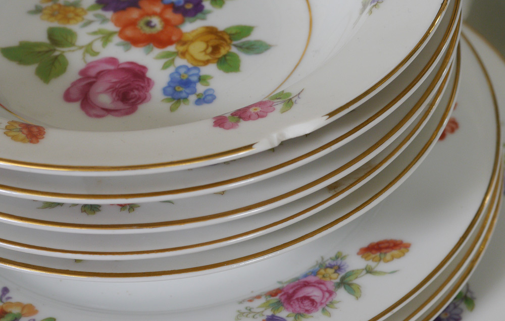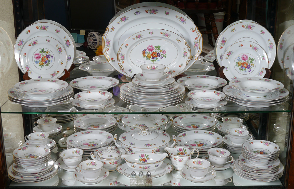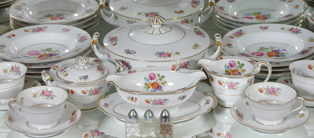 NORITAKE FINE CHINA IN THE DRESALA PATTERN: Approx. 83 pieces to include 12 dinner plates (10''), 12 salad plates, 12 bread plates, 12 soup bowls, 11 dessert bowls, 7 cups, 12 saucers, covered vegetable, gravy boat, creamer, sugar, and 2 platters (12 and 16'').