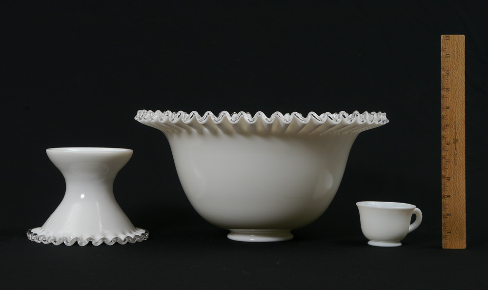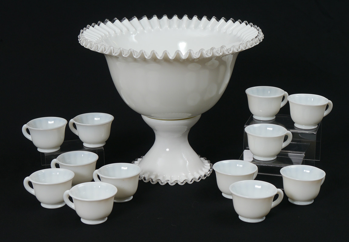 FENTON SILVER CREST GLASS PUNCH BOWL ON STAND WITH THE 12 CUPS: The bowl measures 15'' dia.