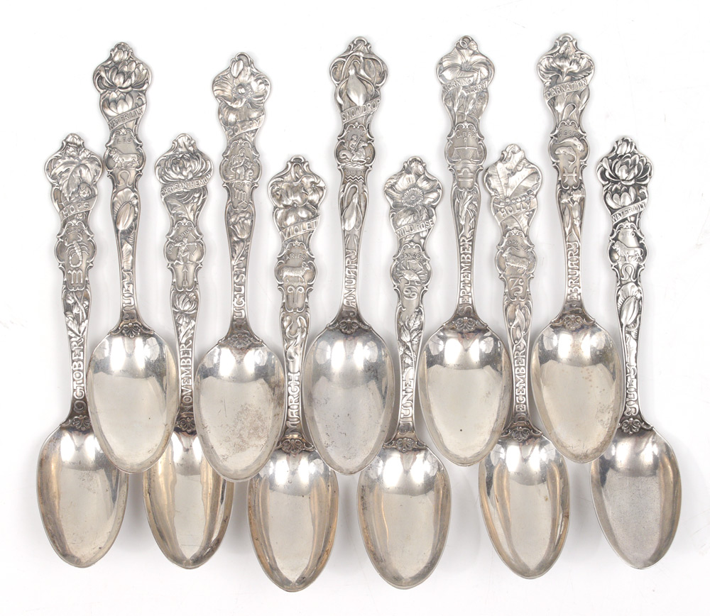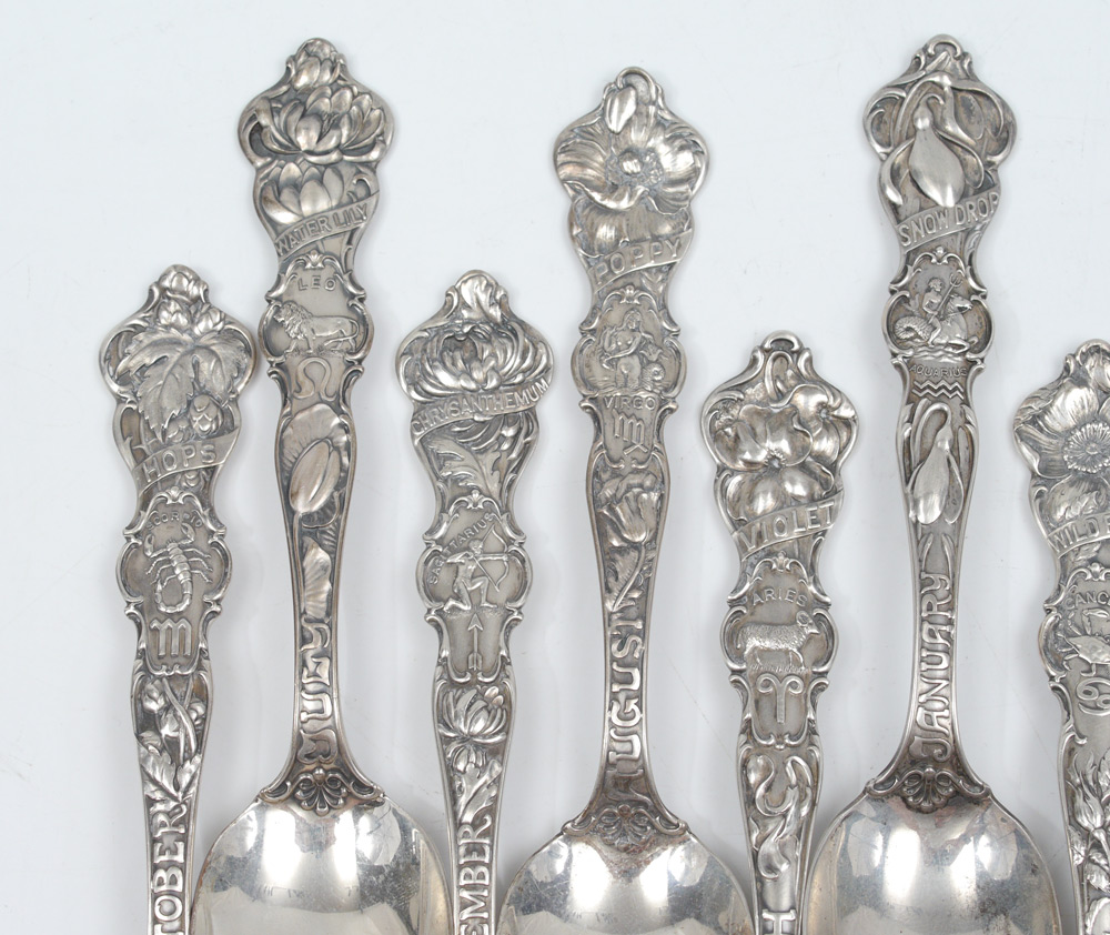 20 CHRISTMAS & ZODIAC STERLING SPOONS: 20 spoons total to include 8 assorted Christmas themed spoons, 4 are of the same design by Gorham. 11 months of the year spoons with zodiac and flower of the month designs by Wallace Silversmiths. Missing 2 months, double of July. Approx. 13 troy oz.