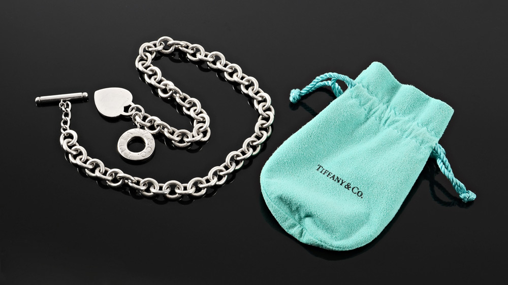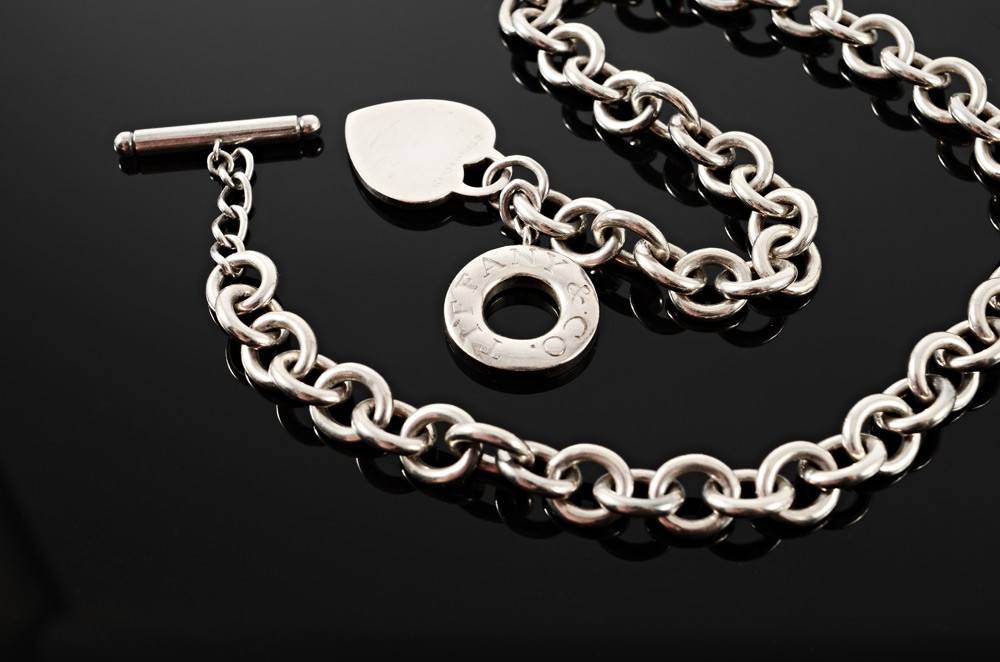 TIFFANY & CO STERLING TOGGLE HEART NECKLACE: Chain with heart and ''lifesaver'' join at the toggle. Length approx. 16.5''. Weight 45.9 grams.