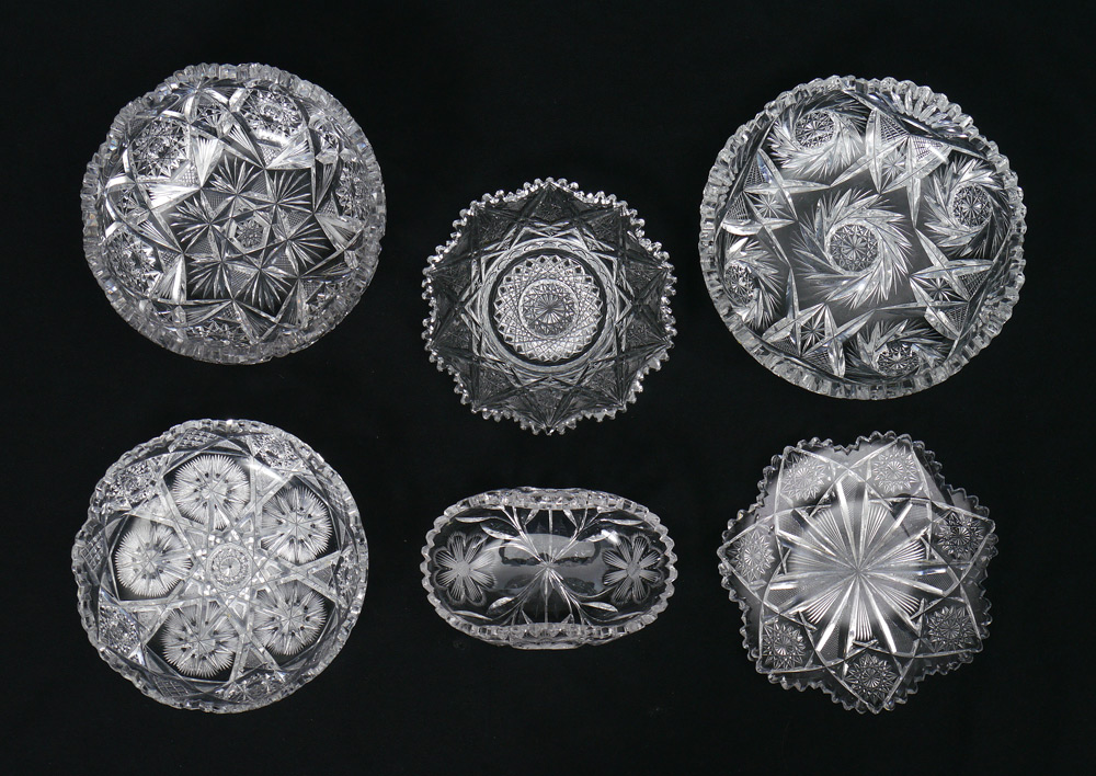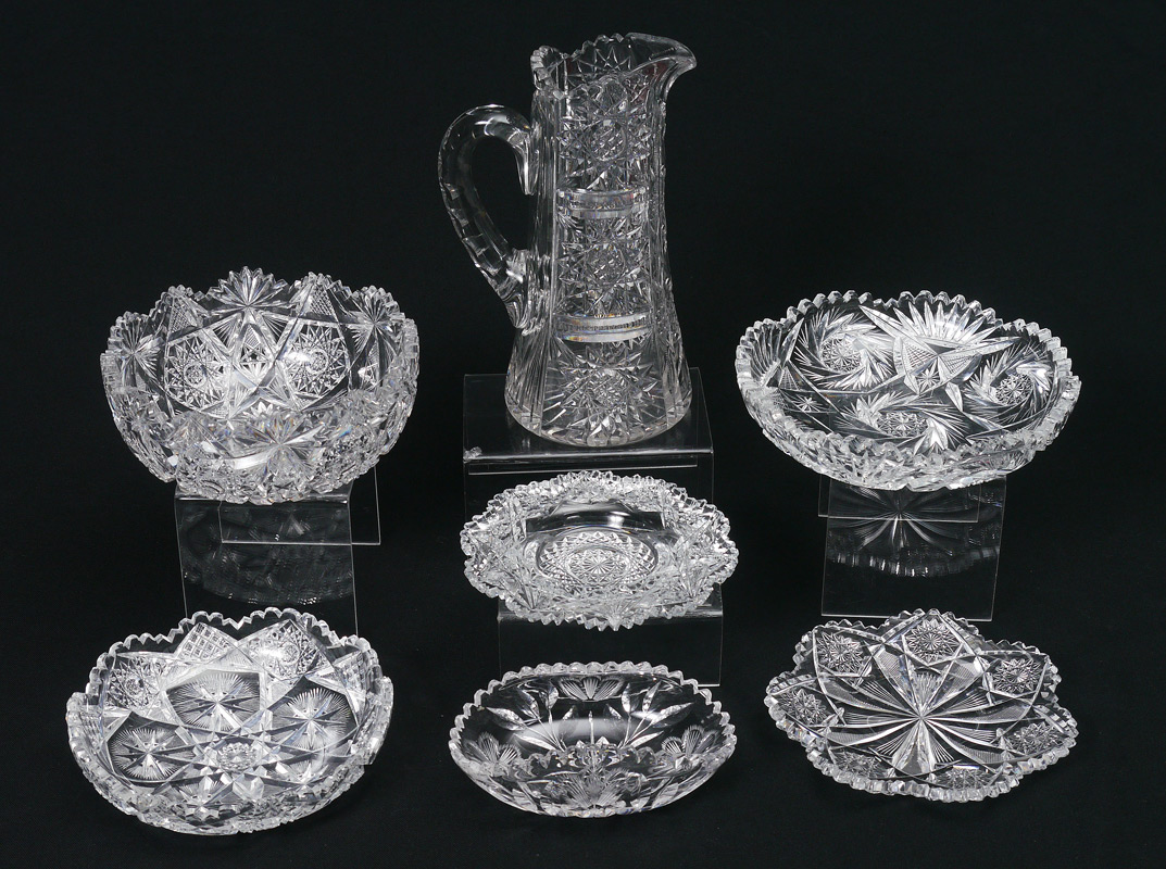 ESTATE COLLECTION OF AMERICAN BRILLIANT CUT GLASS: 7 piece group featuring the 9 1/2'' water pitcher, bowls and dishes including the berry bowl.
