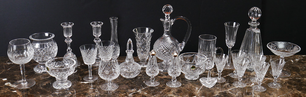 WATERFORD CRYSTAL 26 PIECE ASSEMBLED COLLECTION: 26 pieces assembled patterns to include cordials, vases, compotes, candlesticks, decanters and more. Sold with a Waterford quality decanter, 12 1/4'' h. x 7''.