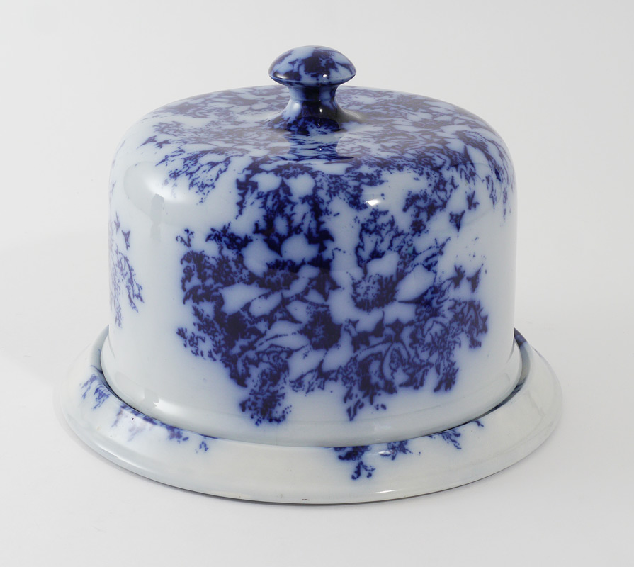 FLOW BLUE FLORAL CHEESE DISH: Covered cheese dish with a floral motif on bell and base. Unmarked, overall measures 6 3/4'' h. x 9 1/2''.