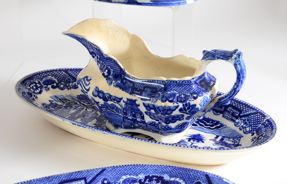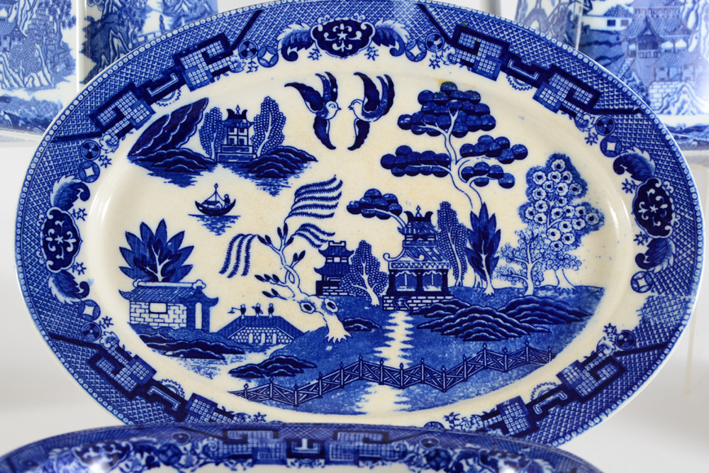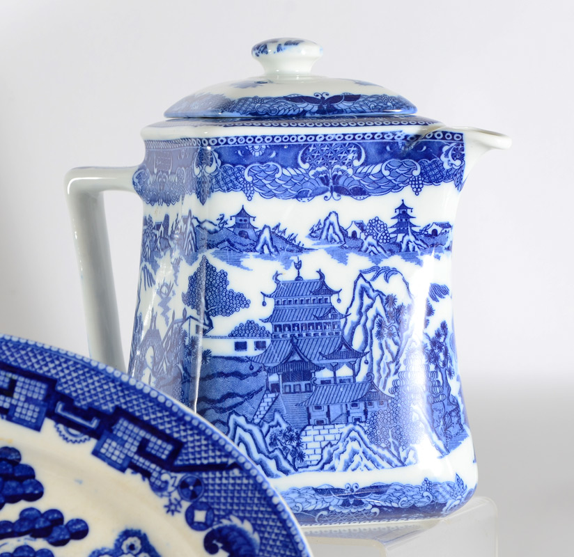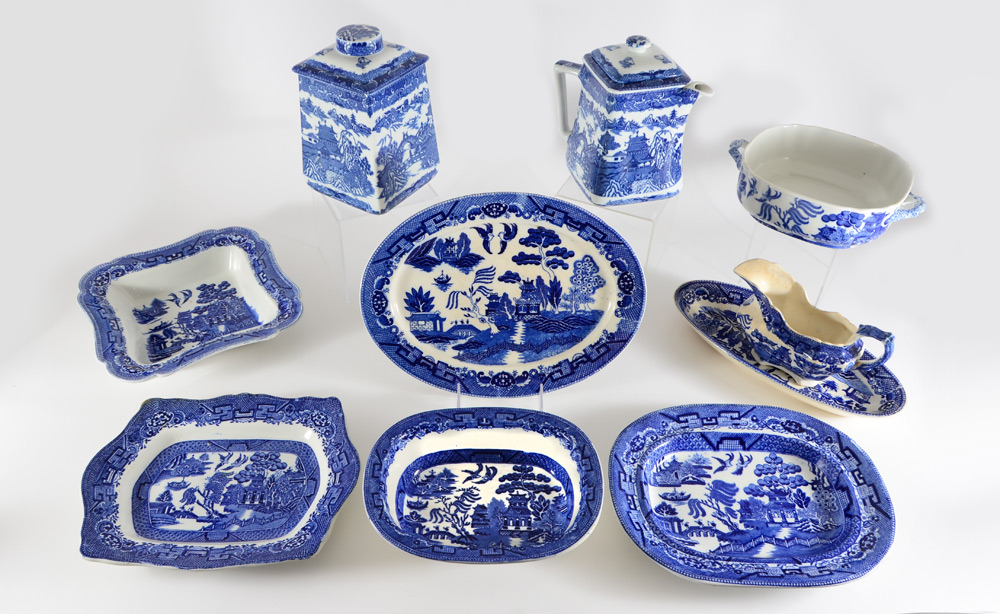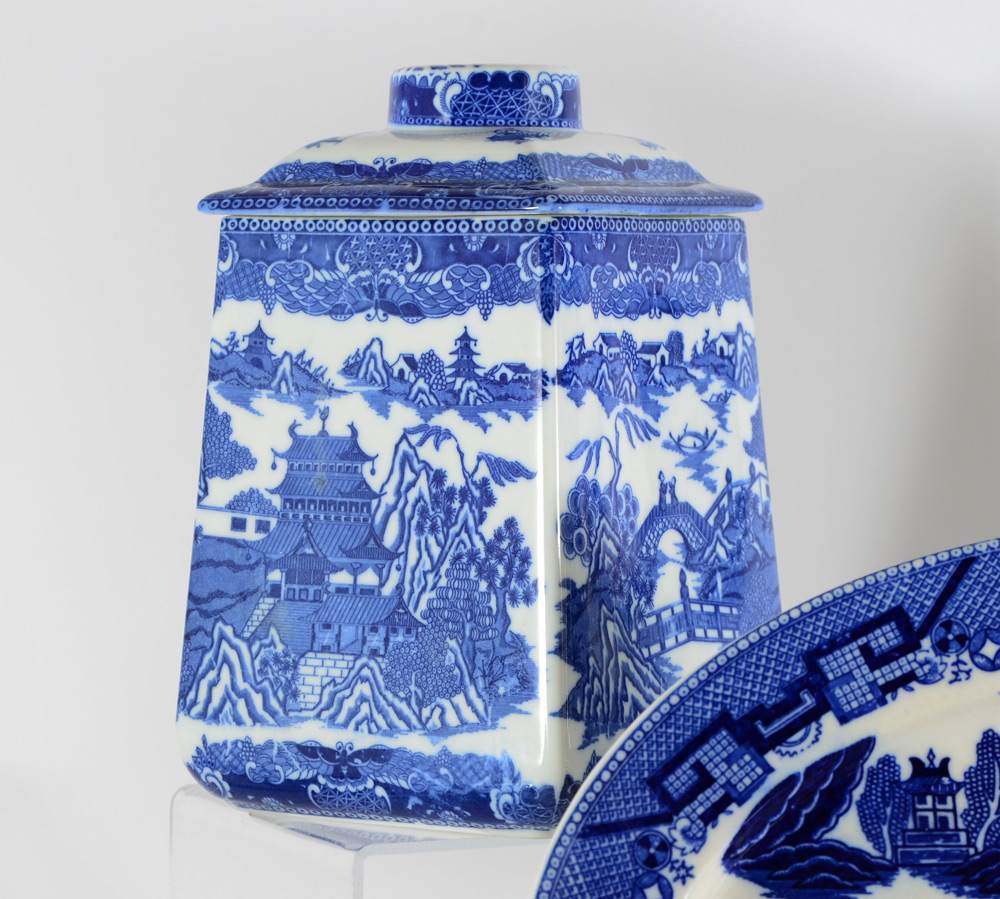 BLUE WILLOW CHINA SERVING PIECES: 9 piece group from Japanese and English makers to include gravy boat, relish dish, 3 platters, 3 bowls and the later Rington Tea Merchant teapot and cannister.
