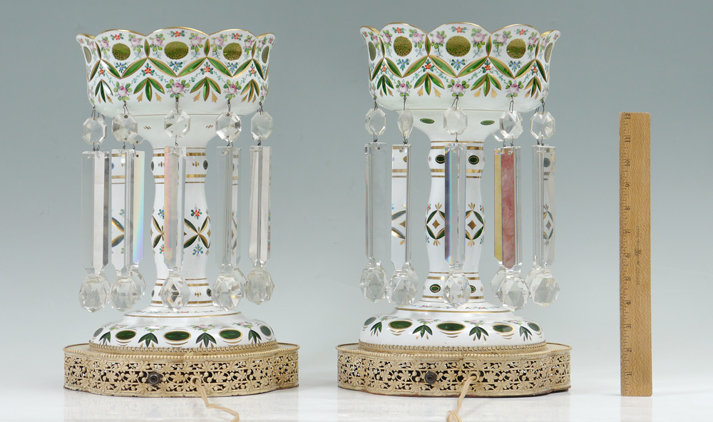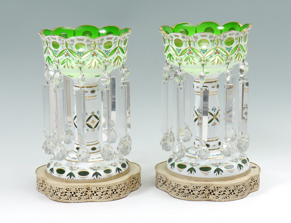 PAIR BOHEMIAN WHITE CUT TO GREEN LUSTERS: Electric, white cased glass cut to green with floral decoration, long crystal prisms, pierced gilt metal base. Overall measure 15 3/8'' h. x 10 1/4''.