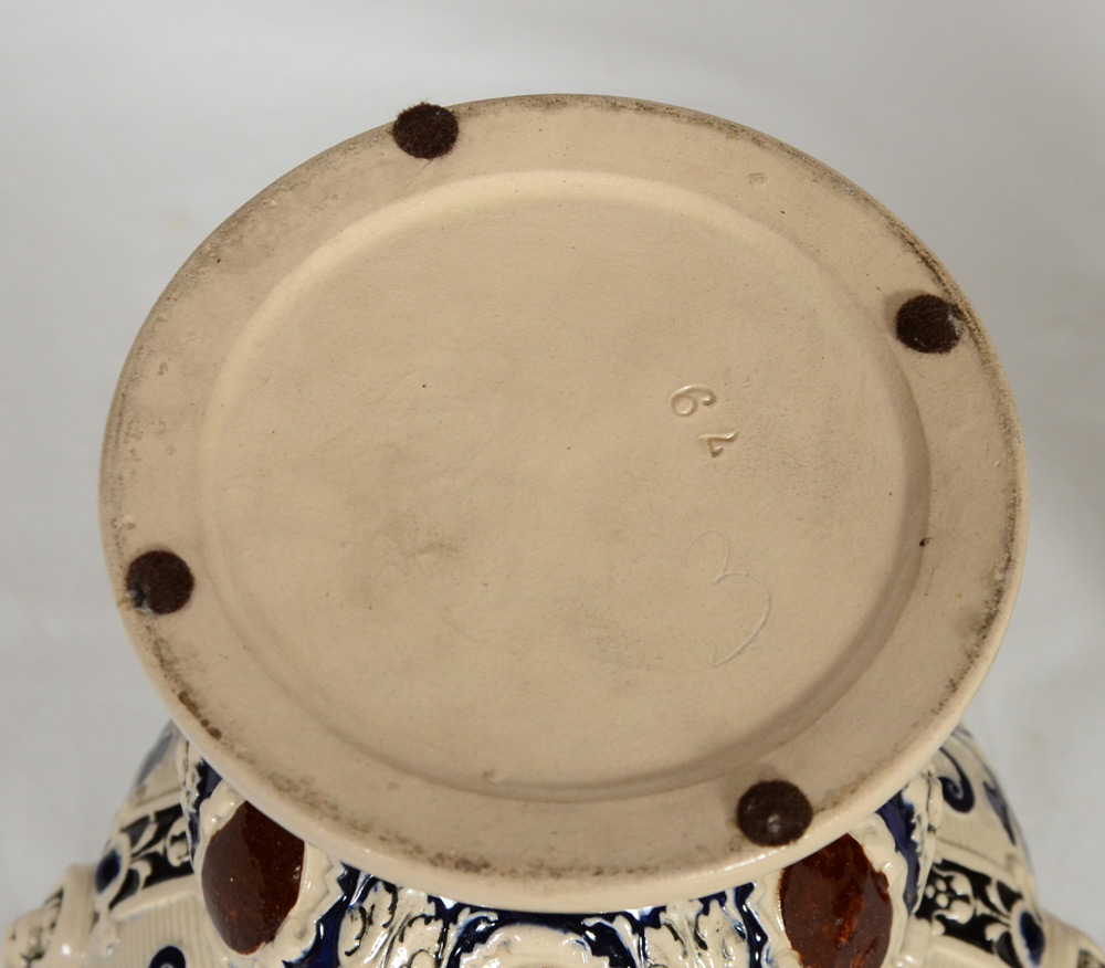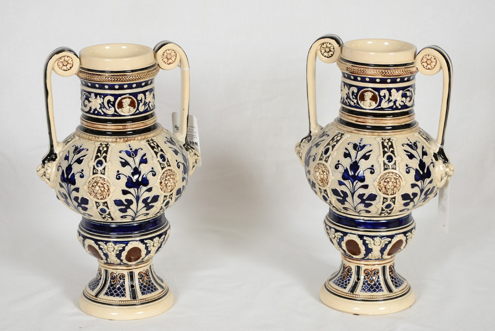 PAIR OF CHERUB AND LION DECORATED GERMAN URNS: Double handle earthenware with richly embossed decoration, high gloss and cobalt glaze. No makers identification. 14 1/2''h.