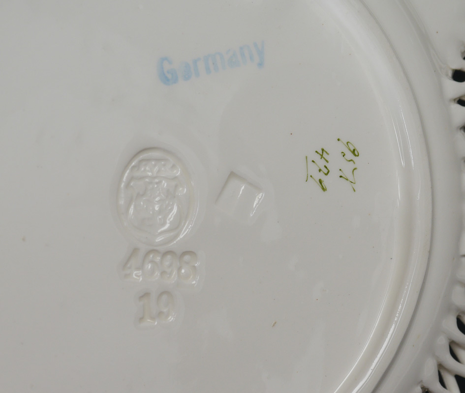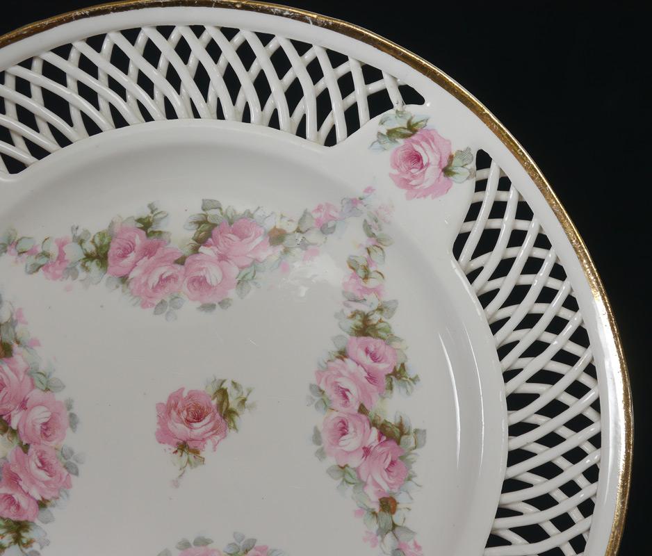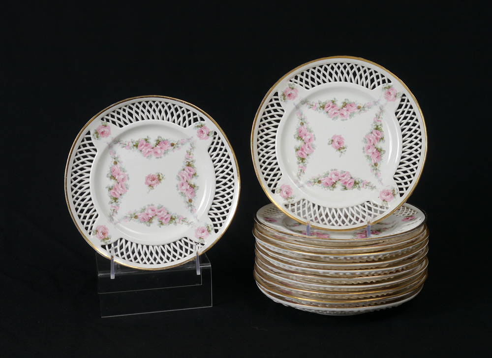 12 MAX ROESLER RETICULATED FLORAL PLATES: Floral swag design with reticulated rim, impressed Max Roesler mark with numbers. Measure 7 3/4'' dia.