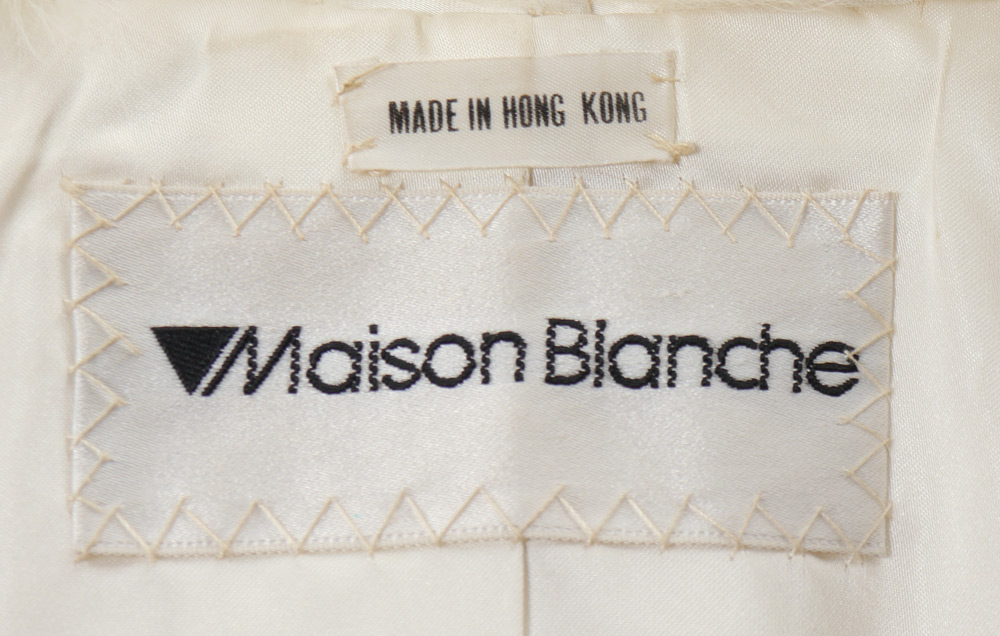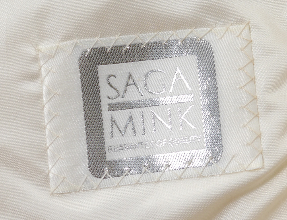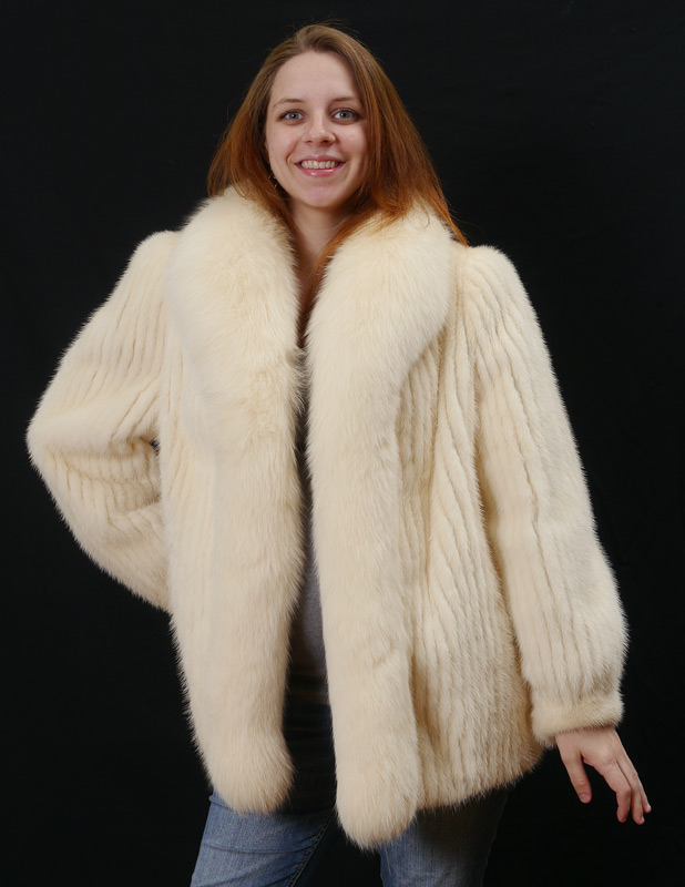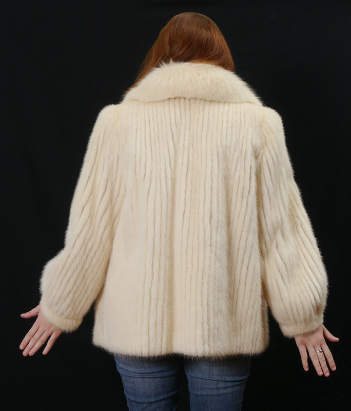 WHITE MINK FUR JACKET: Car coat length with a plush collar and fitted cuffs. Size 18. Maison Blanch label.