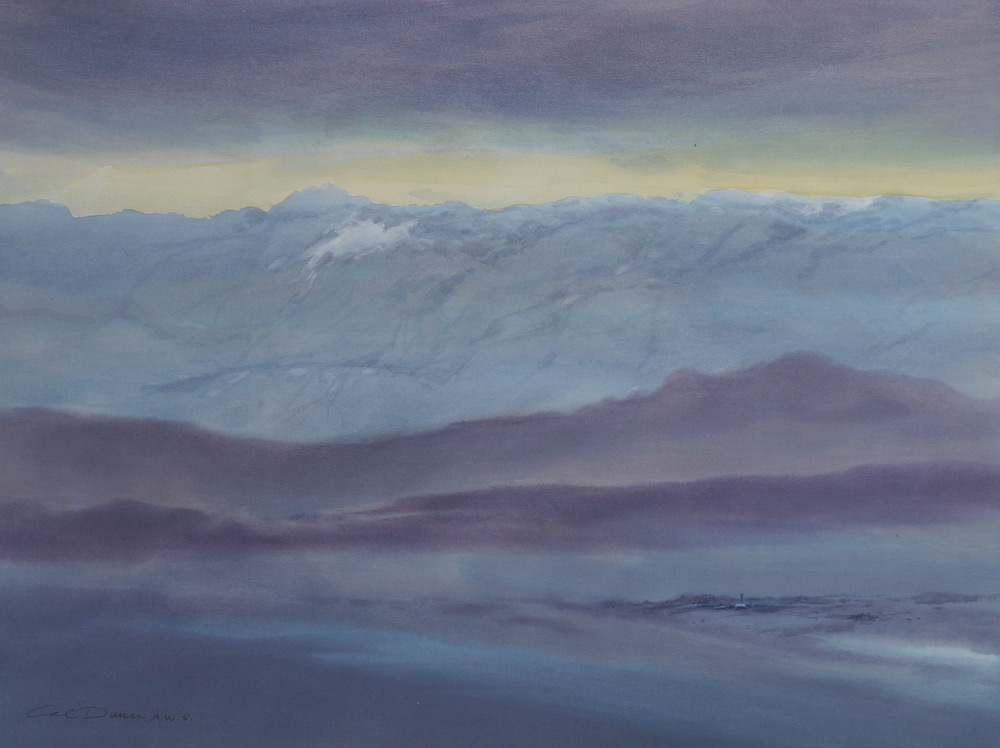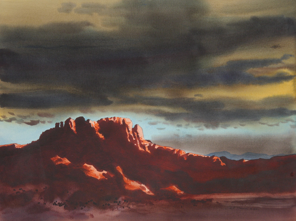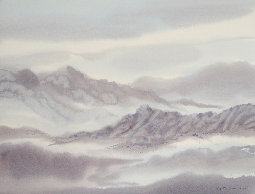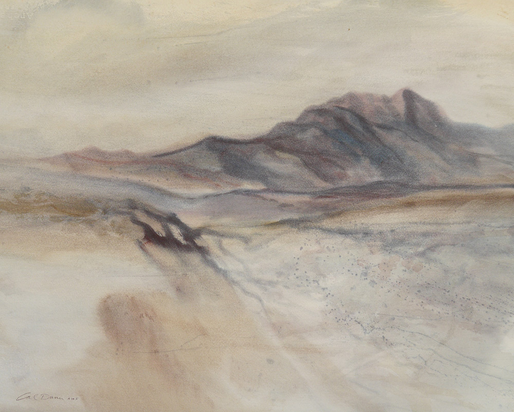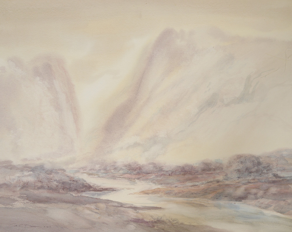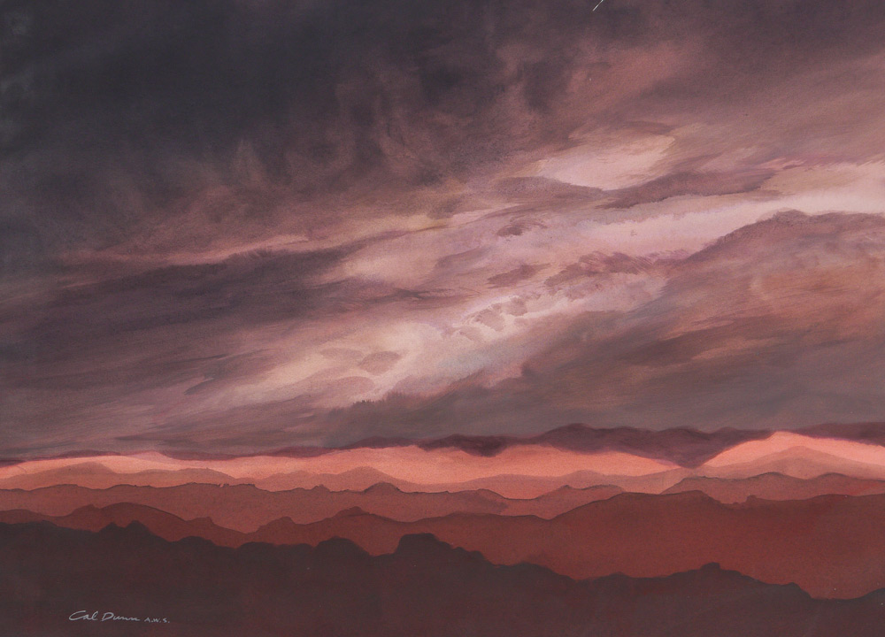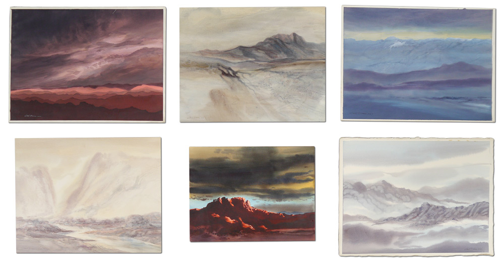 DUNN, Calvin E., (American, 1915- ): 6 Watercolor Landscape Paintings to include; 1) Misty Mountain Morning, 22'' x 28'', signed lower left Cal Dunn, AWS, signed, titled, and #'d 33 verso; 2) Jemez Mountains Afterglow, Watercolor/paper, image size 21 1/4'' x 29 1/4'', signed lower left, signed and titled verso, #'d 135; 3) Mountains in the Cloud, image size 21 1/2'' x 28 1/4'', signed lower right, signed and #'d 54 verso; 4) Sedona Series #4, 18'' x 24''; 5) Morning Haze, 22'' x 27 3/4'', signed lower left, signed and titled verso, #34X; 6) Dusk before Dark, image size 21 1/2'' x 28 3/4'', signed lower left, signed, titled, and #'d 61 verso.