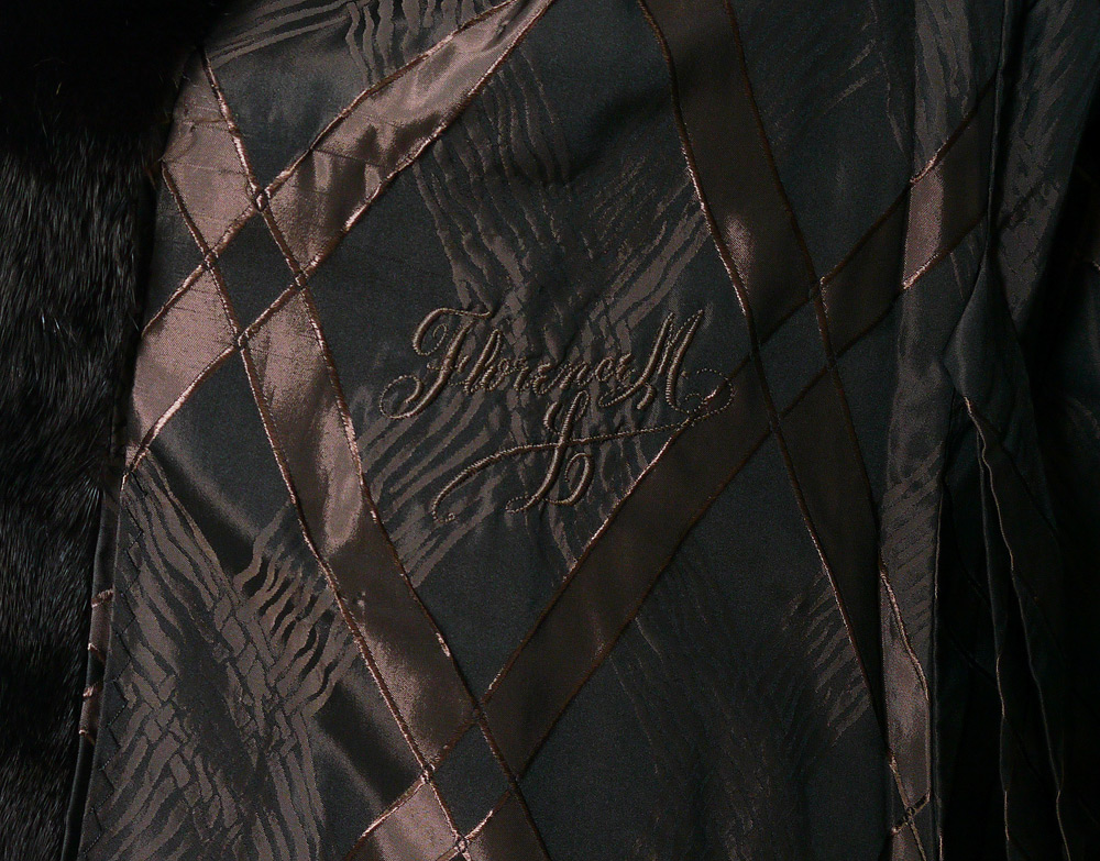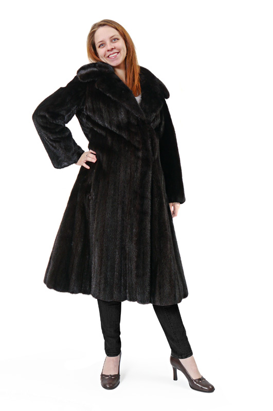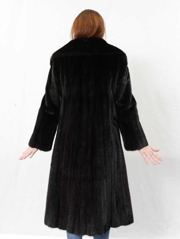 BLACK MINK FUR COAT: Full length with notched collar and bell sleeves. Measures approx. 48'' collar to hem, 18'' shoulder to shoulder and 22'' shoulder to cuff.