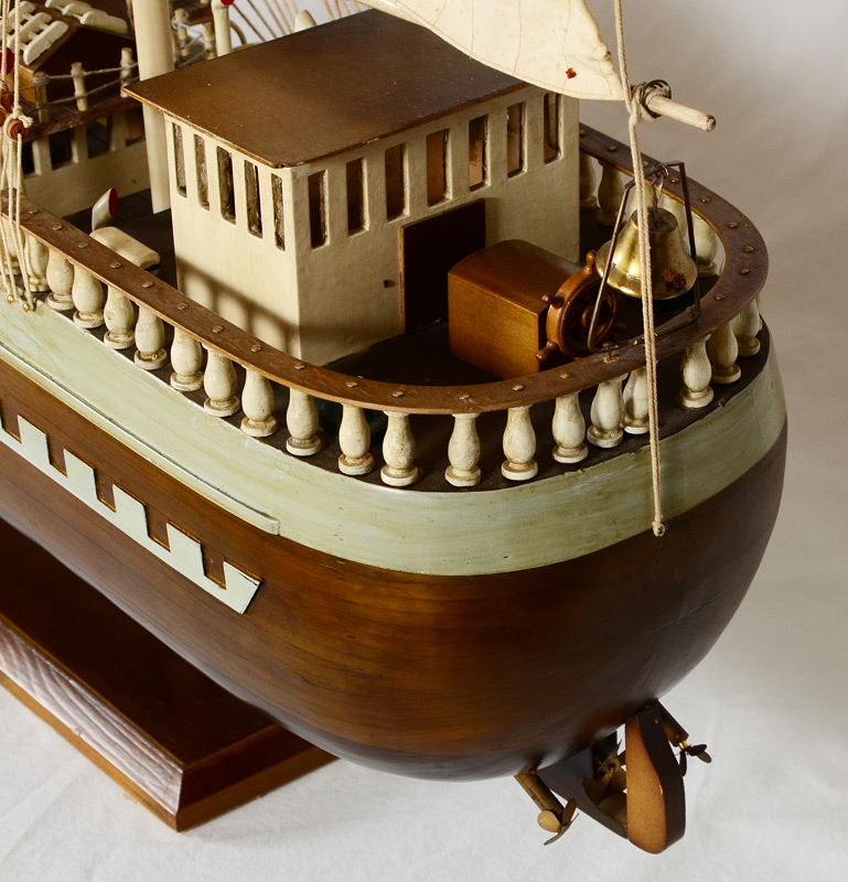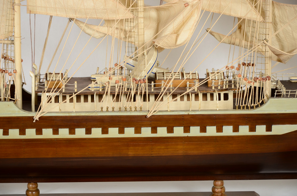 LARGE BELEM FRENCH SHIP SCHOONER MODEL: Exceptionally large model of the French Schooner ''Belem''. Wood with linen sails. Measures 48'' high x 59 1/2'' long x 10'' wide.