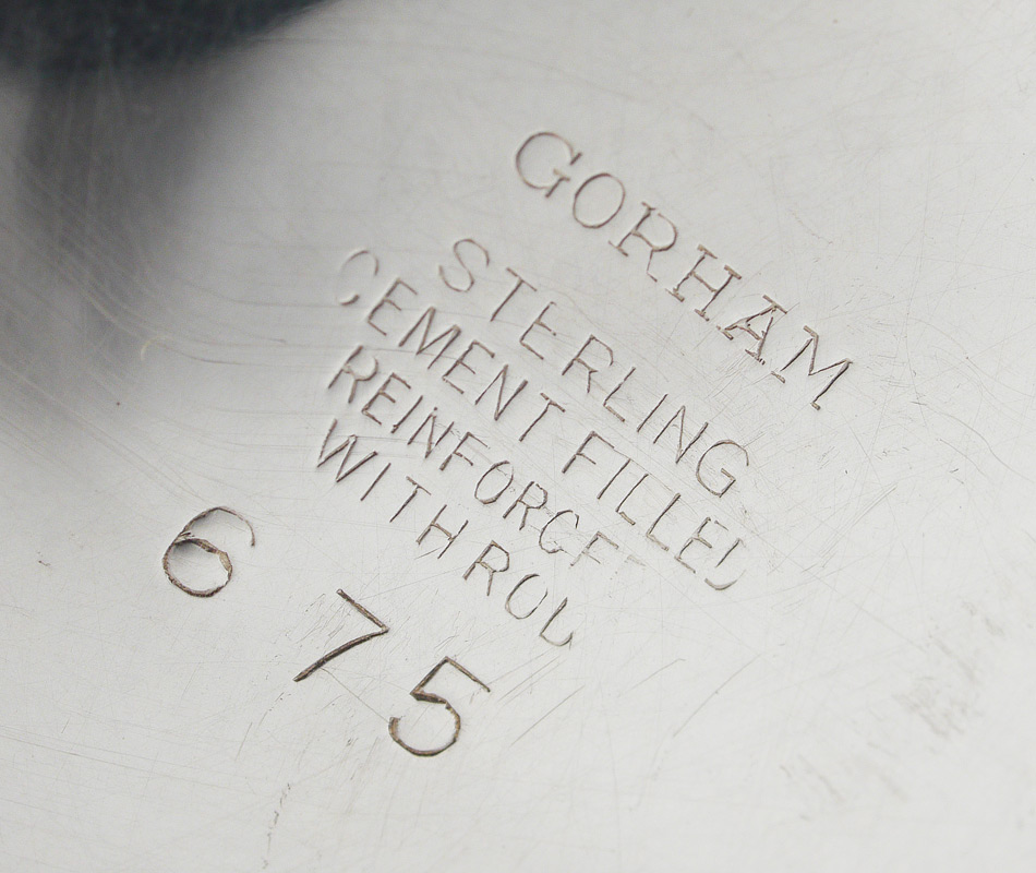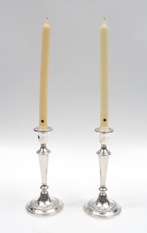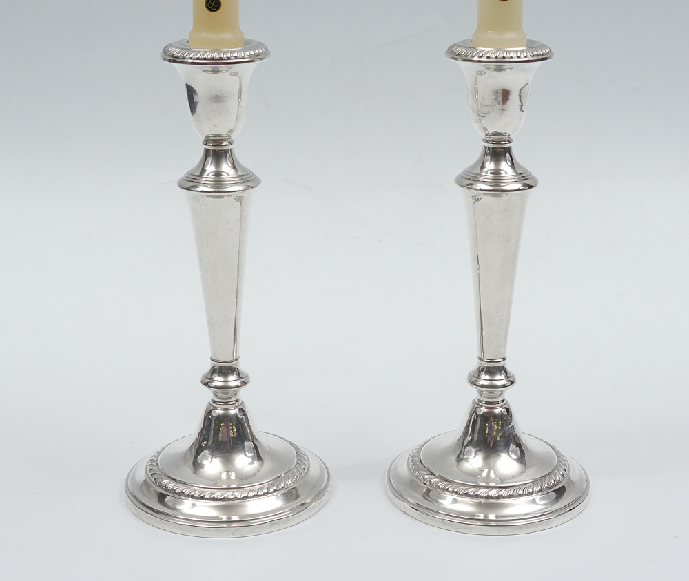 PAIR GORHAM STERLING CANDLESTICKS: Weighted sterling, marked Gorham, ''Sterling, Cement Filled, Reinforced With Rod, 675''. 9 1/4'' high.