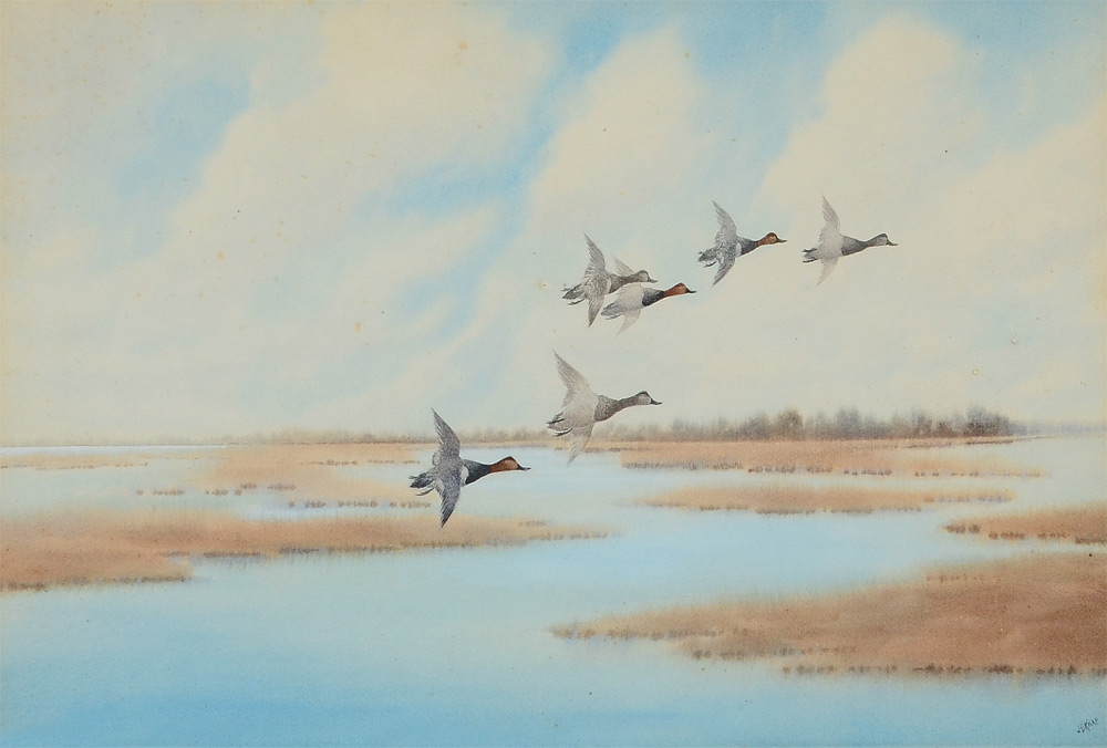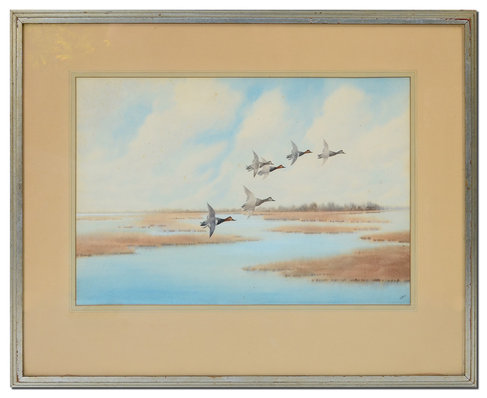 KNAP, Joseph Day, (American, 187-1962): Ducks in Flight over a Marsh, Watercolor, Sight size 13 3/4'' x 20 3/4'', signed lower right, silver gilt frame 23 1/2'' x 29 1/2''.