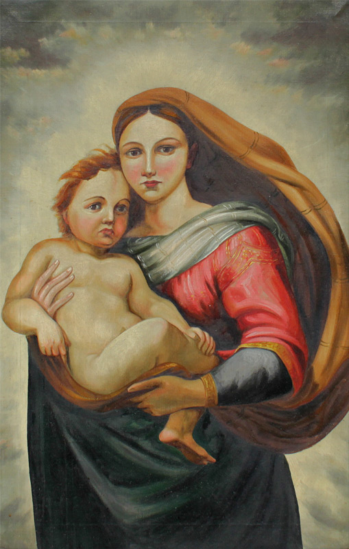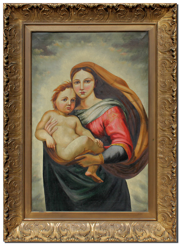 GOOD NAIVE MADONNA & CHILD PORTRAIT PAINTING: Oil/Canvas, 30 1/4'' x 20'', no visible signature, encased in gilded carved and painted wooden gesso frame with wear 38 1/2'' x 28 1/2''.