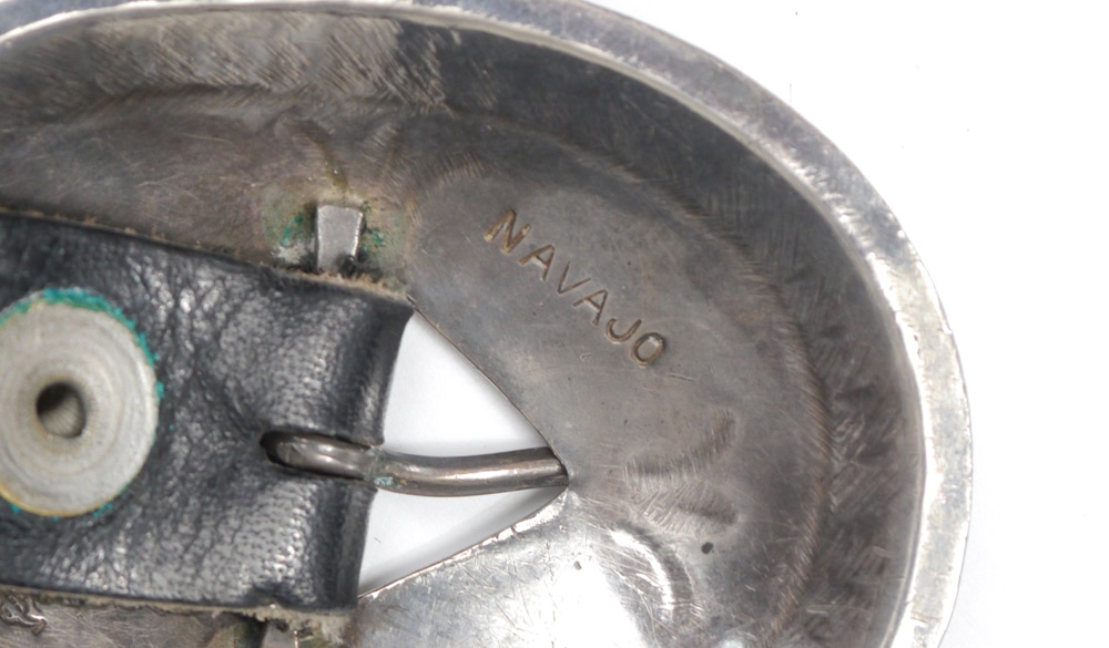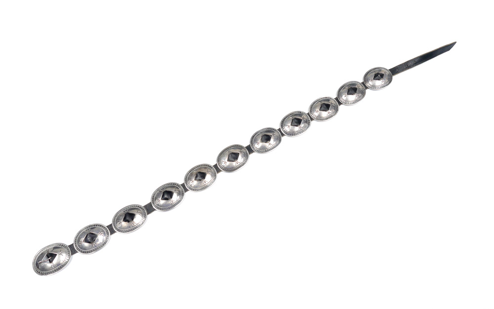NAVAJO ARTS & CRAFTS GUILD SILVER CONCH BELT: Ten concho plus concho buckle on black leather belt. Each measure 1 3/4'' x 2 1/4''. Buckle stamped Navajo and with NACE mark. 33''l. overall.
