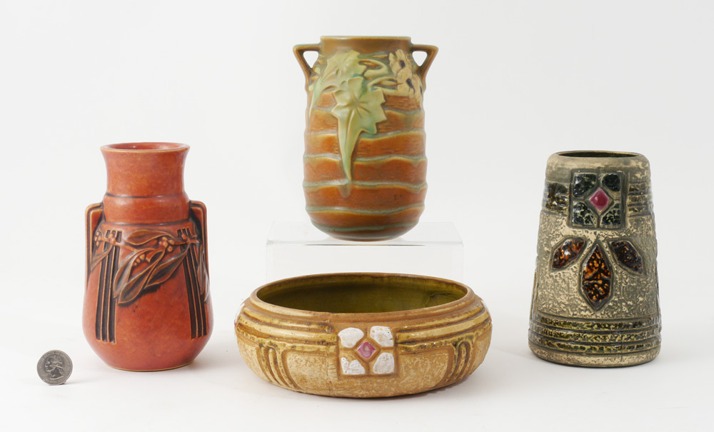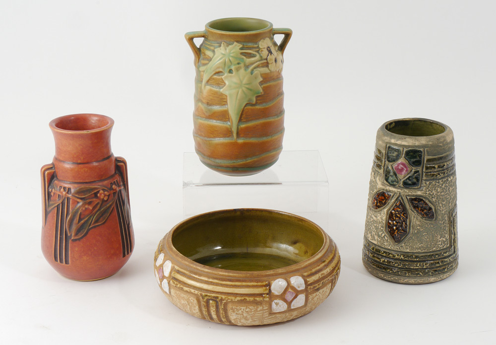 4 PIECE ROSEVILLE POTTERY: 1) Red Laurel vase, 6 1/2''. 2) Brown Luffa vase, 6 1/4''. 3) Mostique vase, 6''. 4) Mostique planter (hairline), 7'' dia.