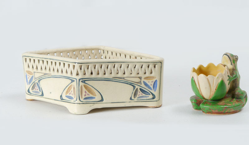 6 PIECE WELLER POTTERY & AN OWENS VASE: 1) Creamware planter, 4'' x 10 3/4''. 2) Woodcraft 9'' vase. 3) Woodcraft log planter, 5'' x 9 1/2''. 4) Woodcraft bud vase, 6 1/4'' tall. 5) Coppertone frog vase, 4 1/2''. 6) Floretta 5 3/4'' vase. 7) Owens pottery standard glaze, twist body vase, 4'' tall.