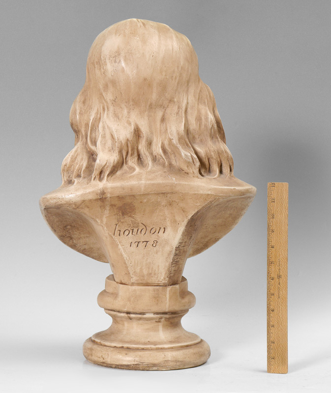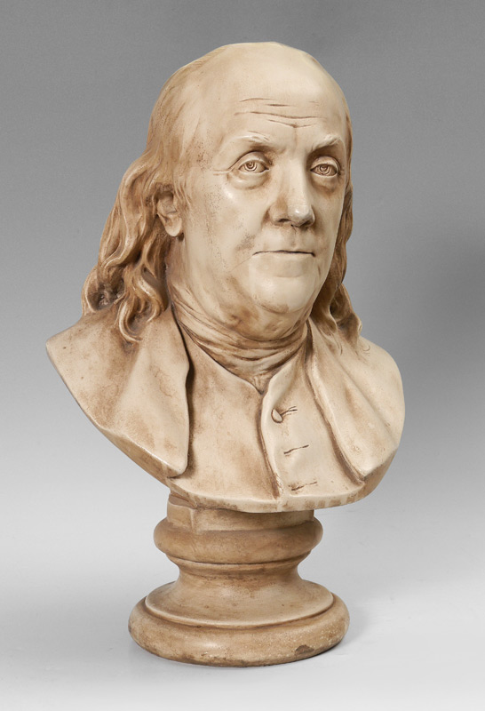 AFTER JEAN-ANTOINE HOUDON BUST OF BENJAMIN FRANKLIN: Large composition bust, marked on back Houdon, 1778. Measures 22 1/4'' h. x 14 1/2'' x 11''.