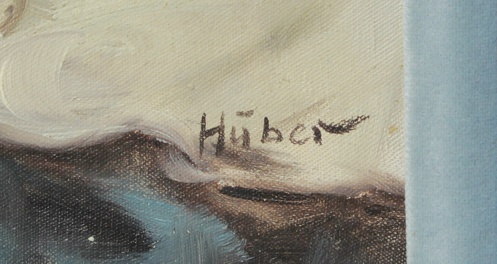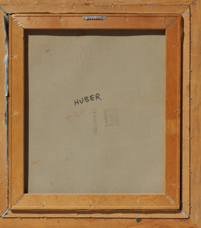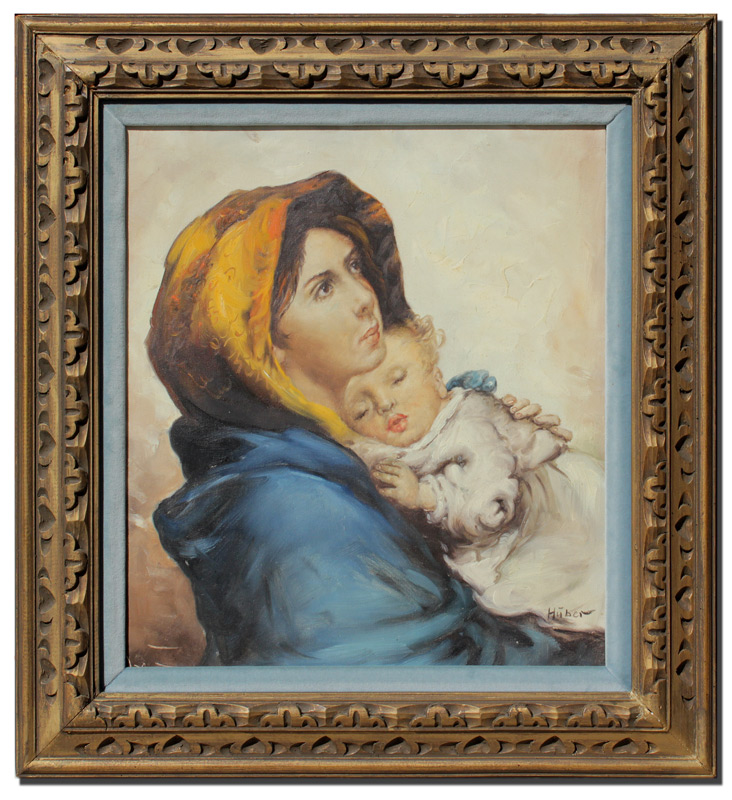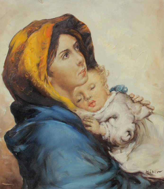 MOTHER & CHILD PAINTING BY HUBER: Oil/Canvas, 22'' x 19 1/2'', signed lower right, encased in a carved and painted frame 30 1/2'' x 28''.