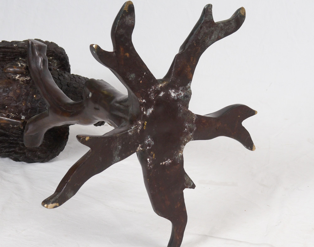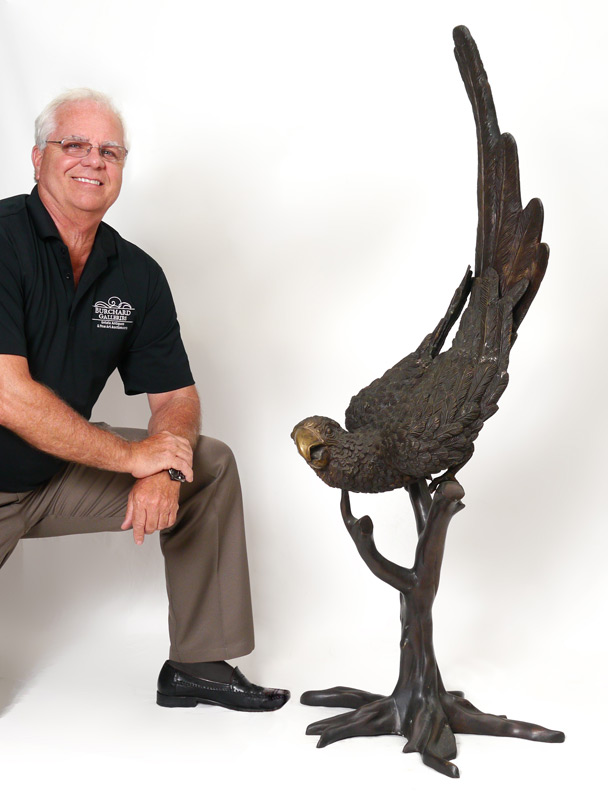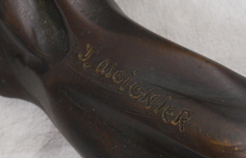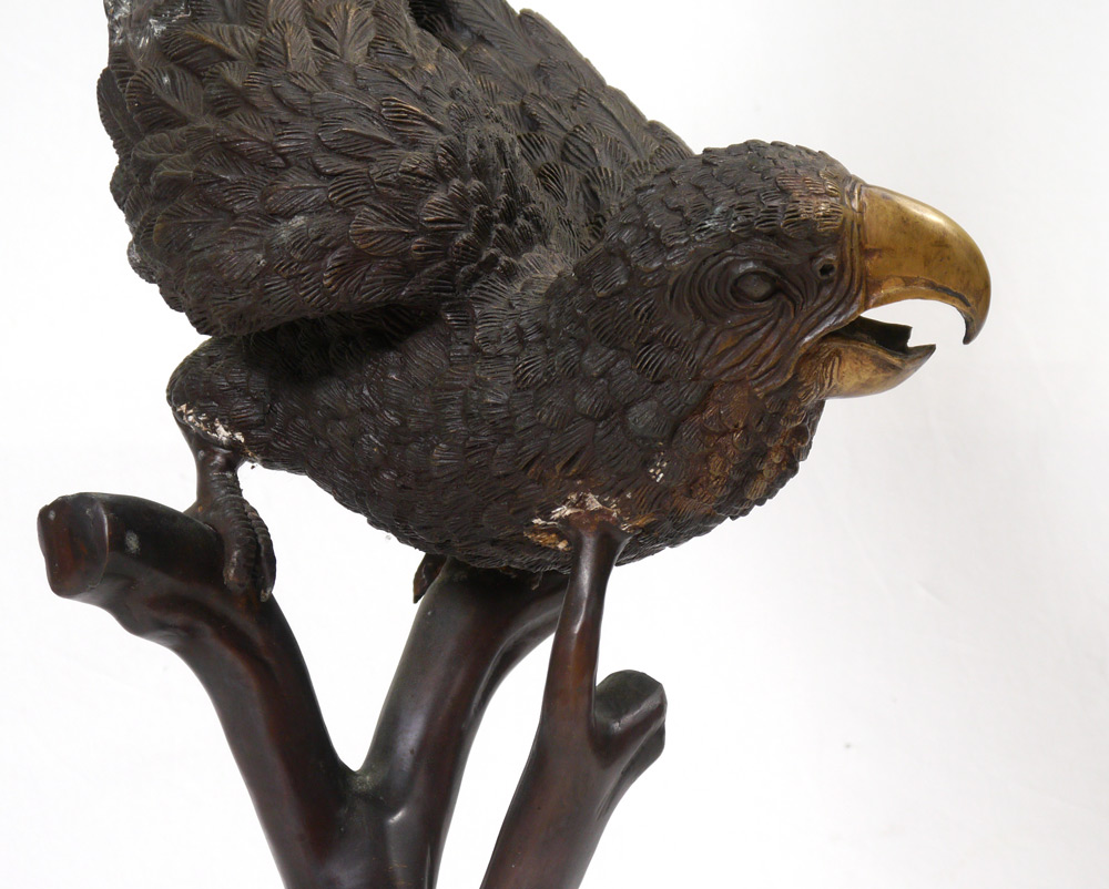 LARGE BRONZE PARROT SIGNED J. MOIGNIER: Sculpture modeled as a Macaw. Impressed J. Moignier to base branch. Measures approx. 54.5'' tall x 20'' x 20''.