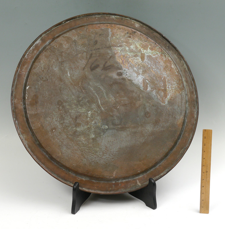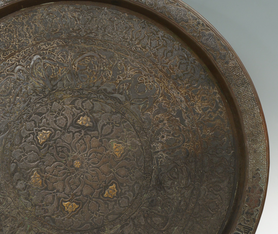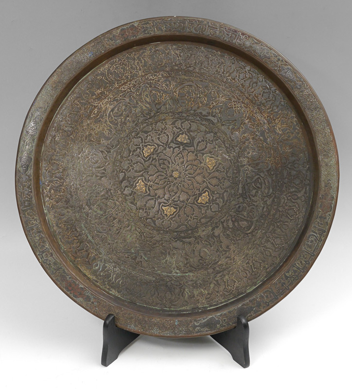 LARGE PERSIAN DAMASCENE MIXED METAL SERVING TRAY: Silver over copper tray with foliate, geometric and writing motifs. A few small spots of enamel remain in protected areas, overall measures 27 1/2'' dia.
