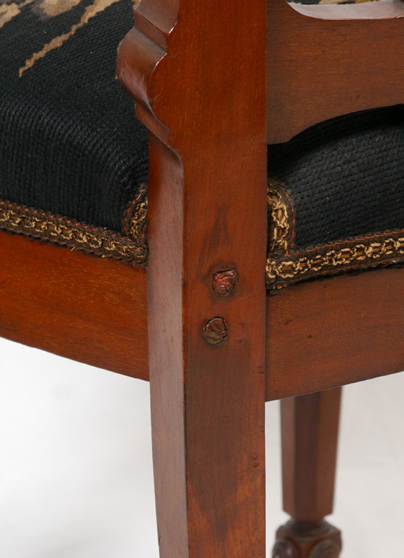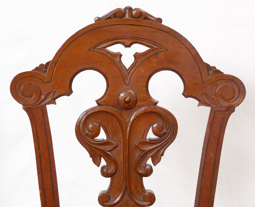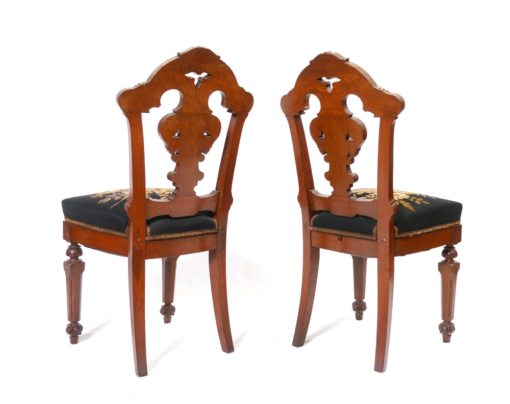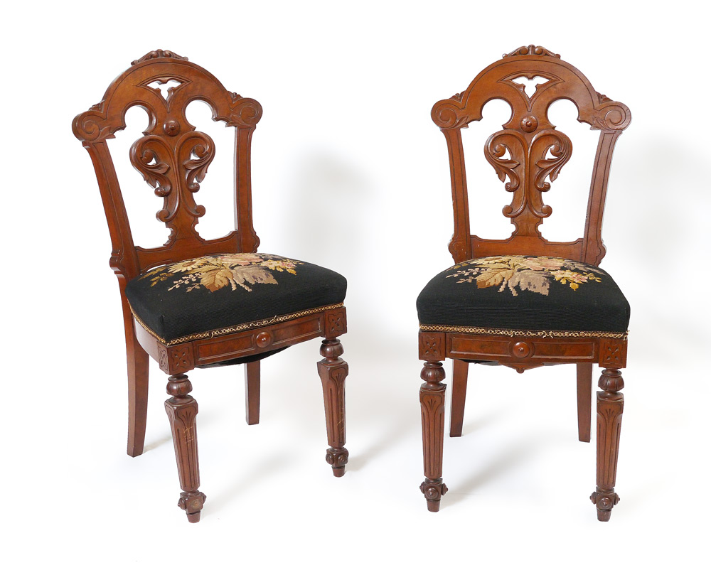 PAIR VICTORIAN SIDE CHAIRS: Each with carved back, frame and front legs, floral motif needlepoint seat cushions. Overall measures 37 1/2'' h. x 17'' x 20''.
