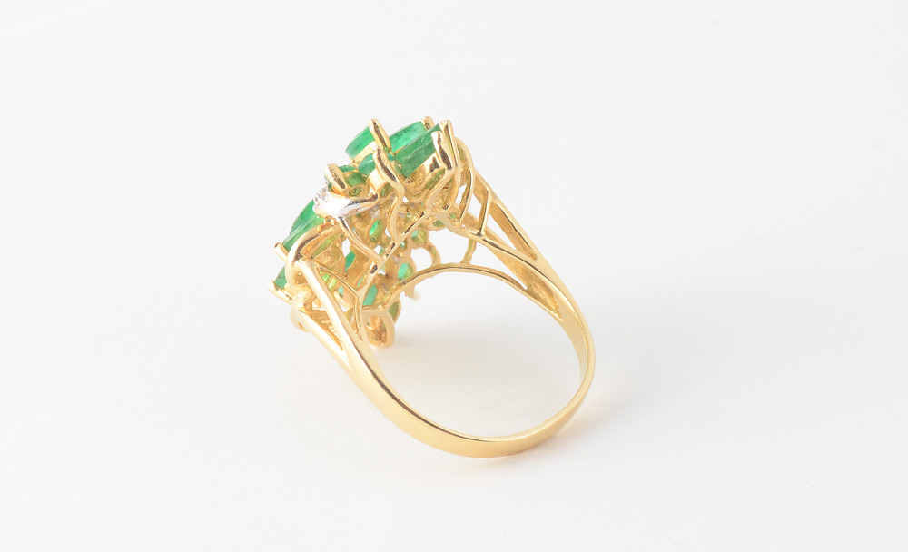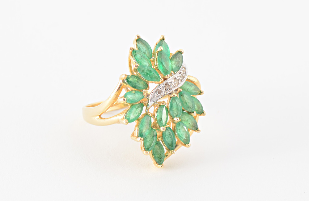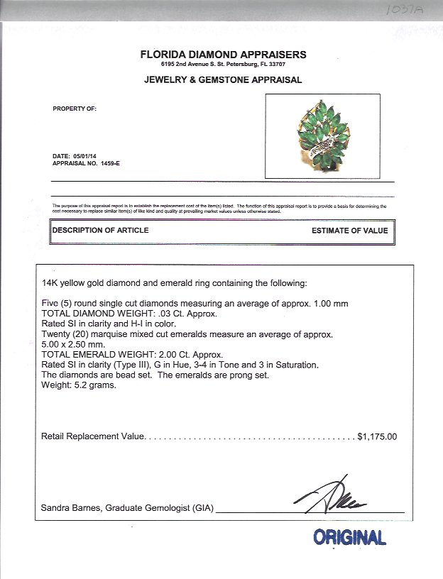 CASCADING EMERALD RING: 14K yellow gold ring with 20 marquise mixed cut emeralds totaling approx. 2.00 Ct., SI in clarity. Diamond accents. Size 7. Weight 5.2 grams. Sold with current Florida Diamond Appraisers GIA graduates appraisal for $1,175.