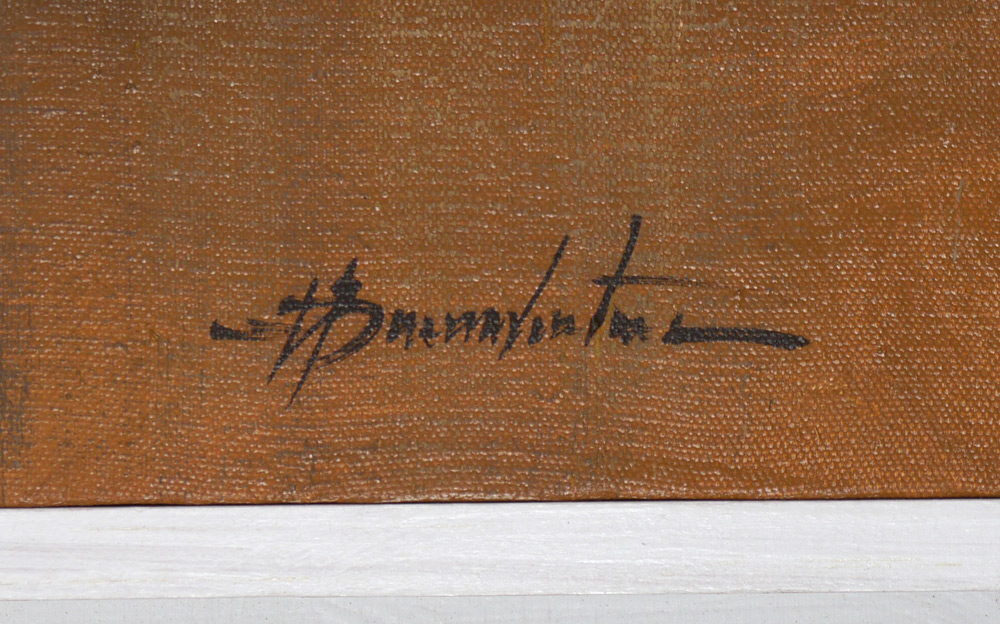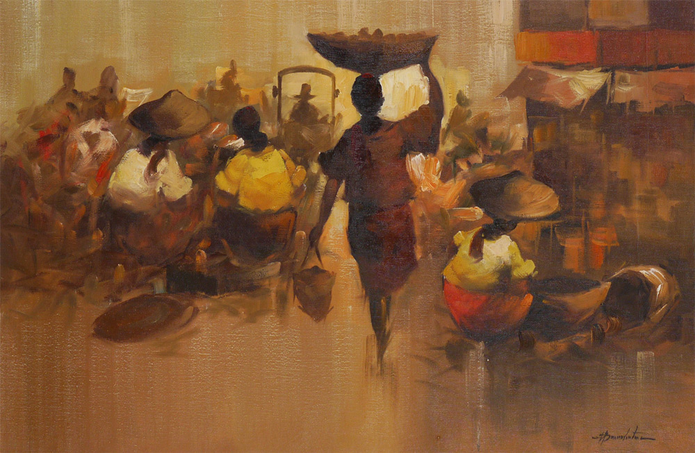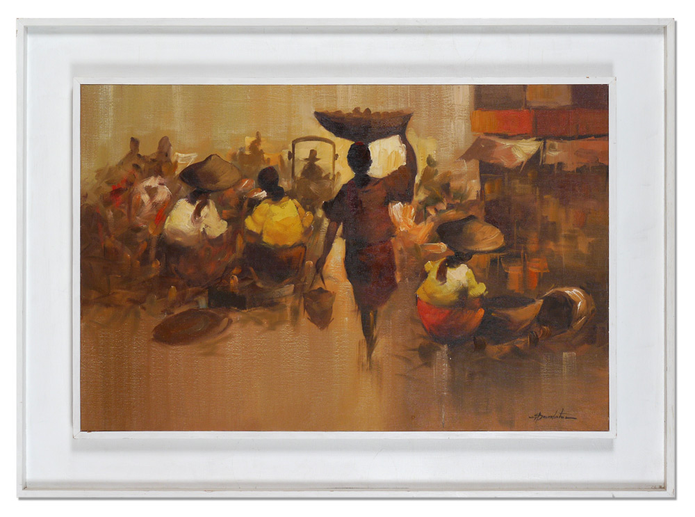 BUENAVENTURA, Cesar, (Filipino, 1922-1983): Busy Market Scene, Oil/Canvas mounted to board, 23'' x 35'', signed lower right, encased in custom white frame 32 1/2'' x 44''.
