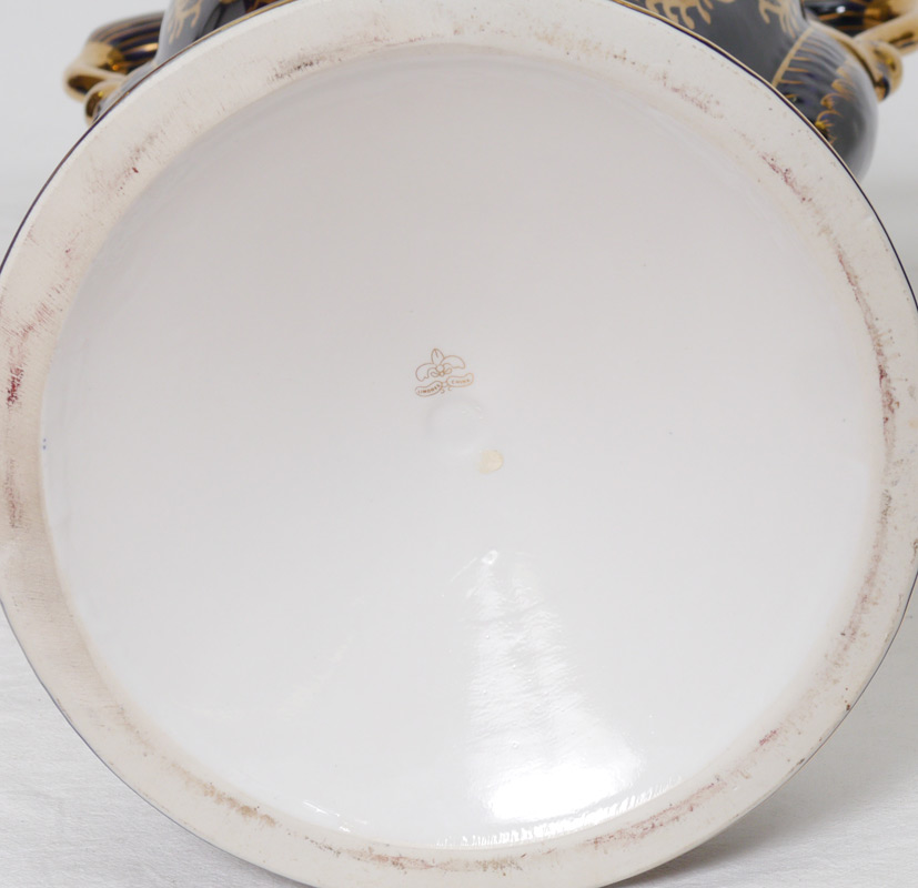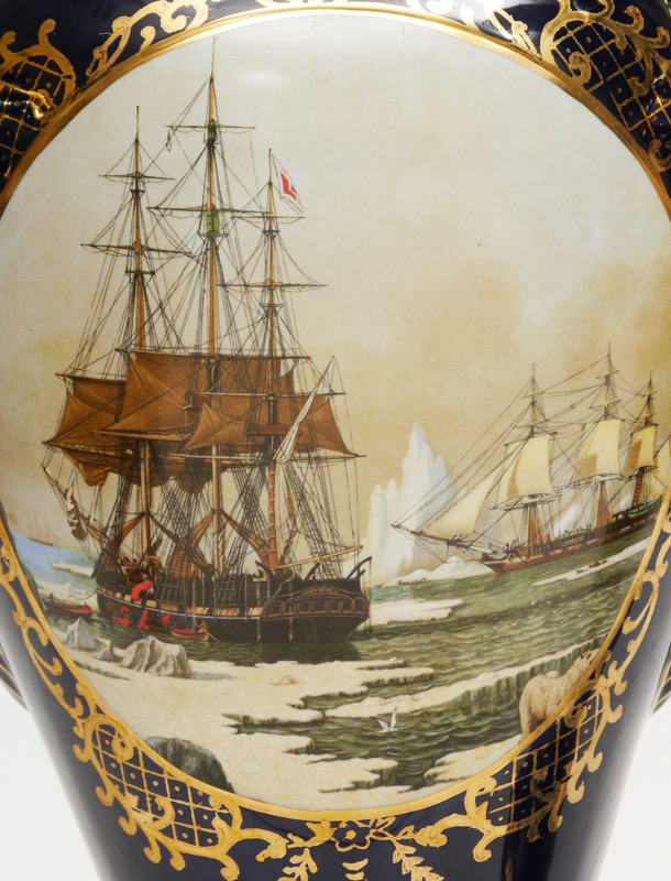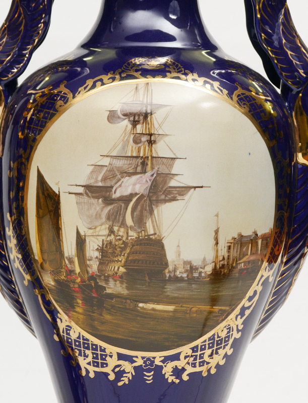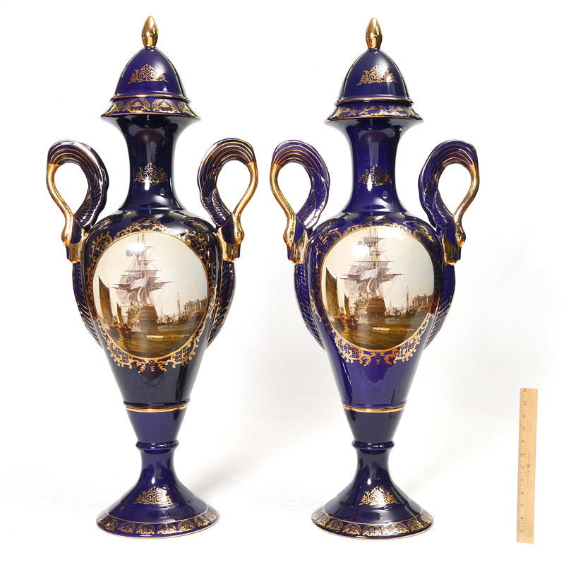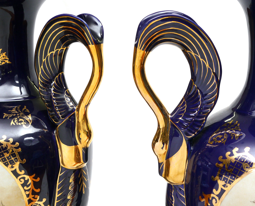 PAIR LARGE LIMOGES CHINA FLOOR VASES: Decorative pair of covered vases with gilt decoration on cobalt ground, figural swan handles, scenes of ships in reserves on either side. Marked on base Limoges China. Overall measure 41'' x 17''.