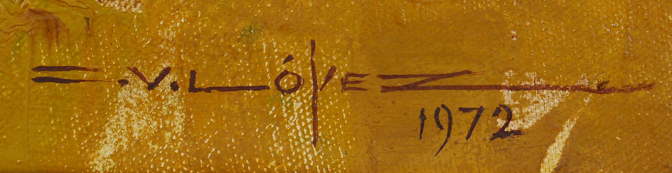 LOPEZ, Crispin Villafuerte, (Filipino, 1903-1985): Abstract Scene with Figures, Oil/Canvas mounted to board, 29 1/4'' x 29 1/2'', signed lower right, dated 1972, encased in painted white frame 38 1/2'' x 38 1/2''.