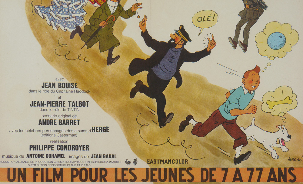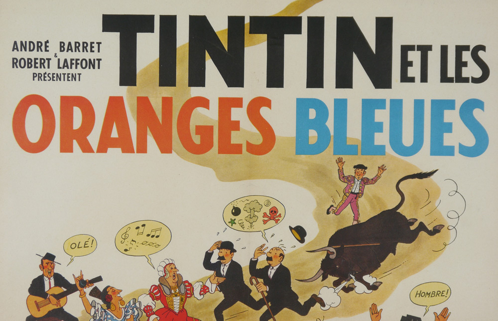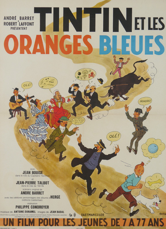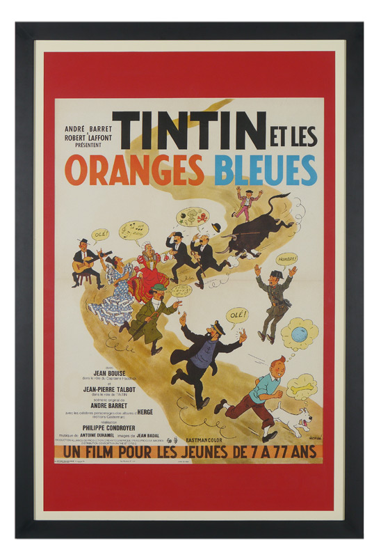 FRENCH TINTIN BLUE ORANGES MOVIE POSTER: In French, titled ''Tintin et les Oranges Bleues'' , starring Jean-Pierre Talbot, released 1964. Sight size 30 3/4'' x 22 3/4'', framed 43 1/4'' x 29 3/4''.