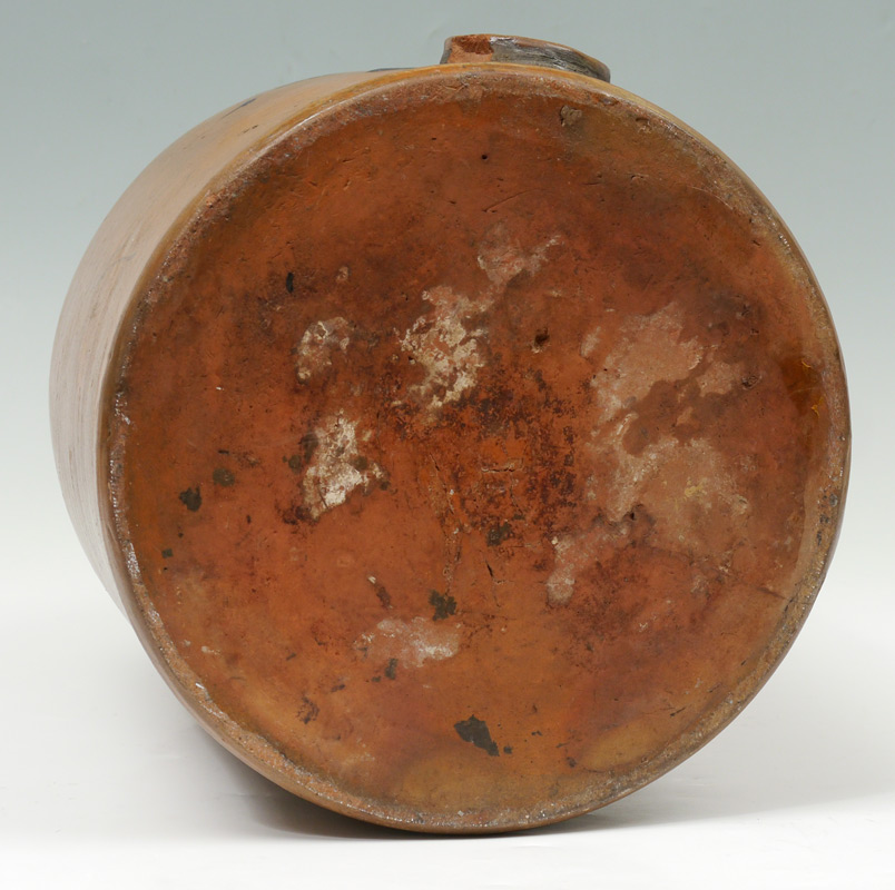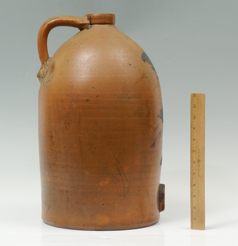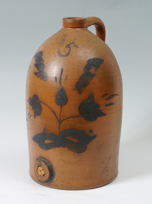 5 GALLON BLUE DECORATED STONEWARE WATER COOLER: Unmarked, hand painted floral decoration with number 5. Measures 20'' h. x 12''
