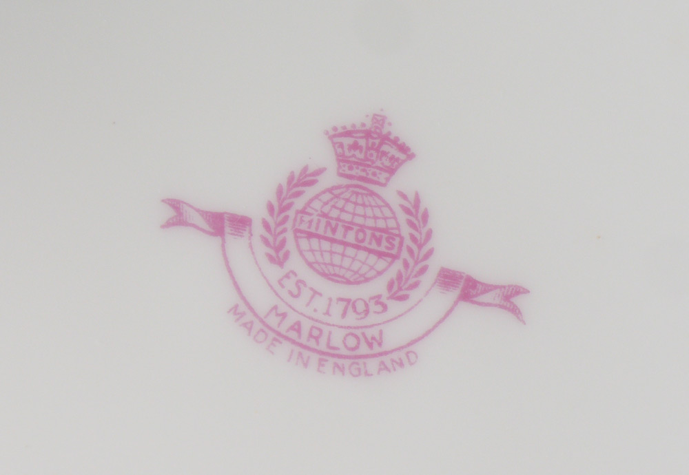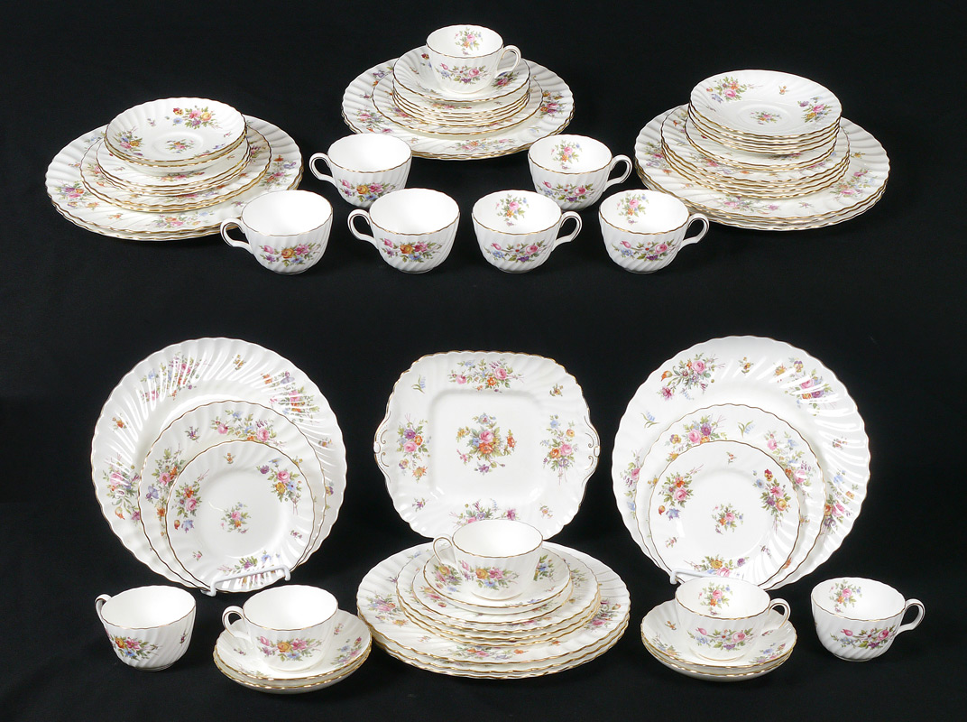 MINTON ''MARLOW'' FINE CHINA FOR 12: Approx. 61 pieces to include 12 each of dinner plates (10 1/4''), salad plates, bread plates, cups and saucers. Also the 9'' cake plate.