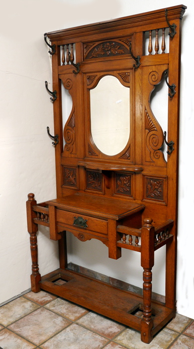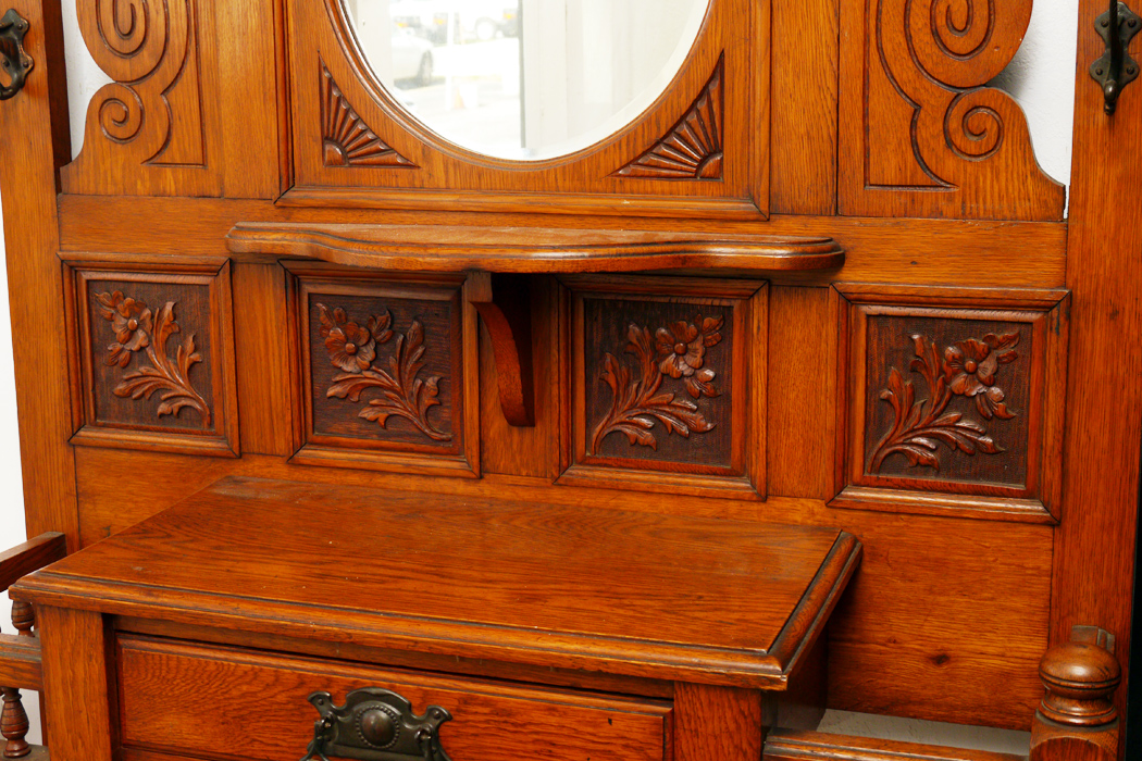 CARVED VICTORIAN OAK HALL TREE: Back with carved panels, spindles, 8 hooks, shaped beveled glass mirror with open shelf underneath. Base with single drawer, spindle gallery, turned front legs. Overall 75 1/2'' x 40 3/4'' x 13 3/4''.