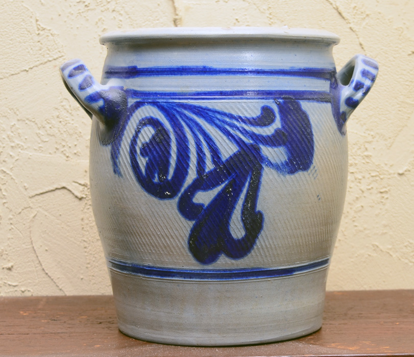 BLUE DECORATED STONEWARE CROCK: Hand painted floral decorated, incised ridges on body, full formed handles. Unmarked, measures 9 1/2'' h. x 10 1/4''.
