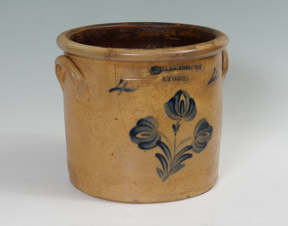 T. HARRINGTON LYONS DECORATED STONEWARE CROCK: 4 gallon crock, hand painted blue decorated floral motif, impressed T. Harrington, Lyons. 11'' h. x 13 3/4''.