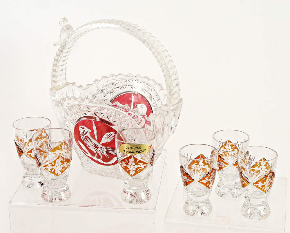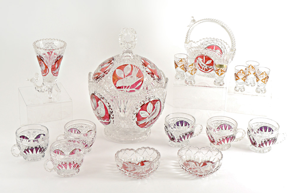 HOFBAUER 17 PIECE FLASHED CRYSTAL PUNCH BOWL AND MORE: 11 pieces with bird on branches motif to include covered punch bowl (overall 13'' h. x 8 1/2''), 6 cups, 2 candy dishes, basket, footed glass. Sold with 6 cordials of another pattern, 3'' h.