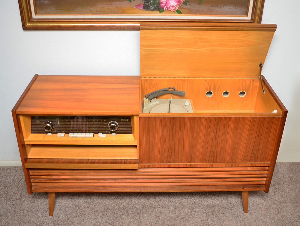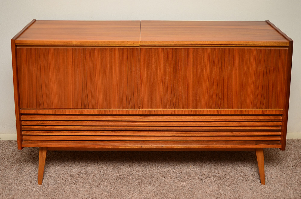 TELEFUNKEN MID CENTURY MODERN STEREO CABINET: Nice mid century design cabinet, receiver hidden behind panel on the left, turntable under lid on right. Measures 33 3/4'' h. x 55'' x 15 3/4''.