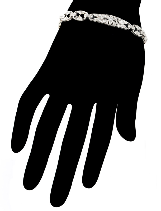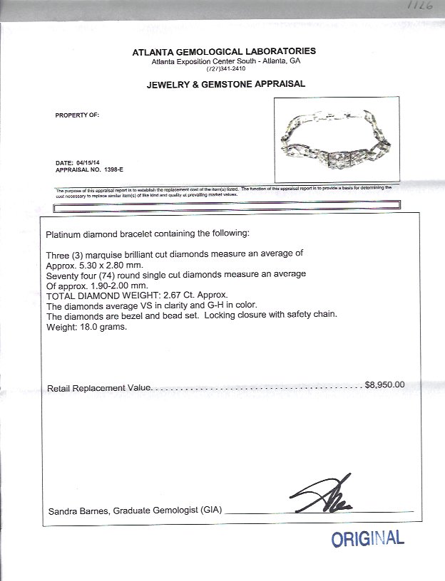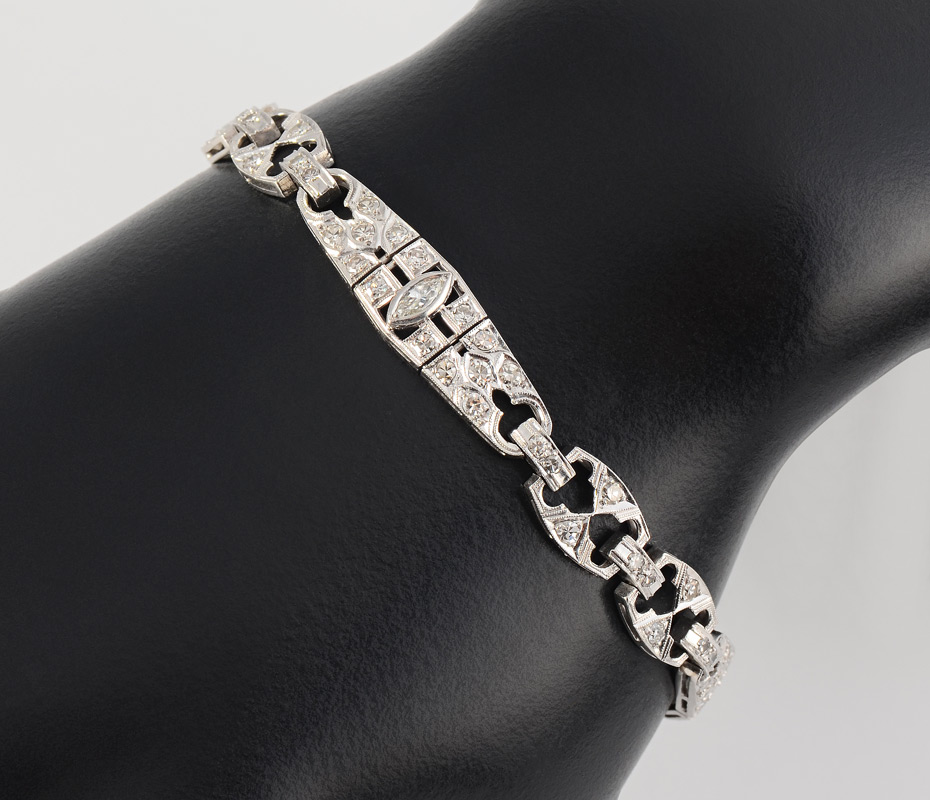 RETRO DECO PLATINUM & DIAMOND BRACELET: Link bracelet of finest detail. 3 marquise and 74 round single cut diamonds total approx. 2.67 Ct., VS clarity and G-H color. Locking closure with safety chain. Length 7''. Weight 18 grams, Sold with current Atlanta Gemological GIA graduate's appraisal for $8,950.
