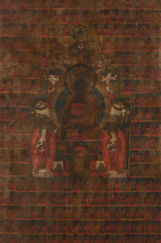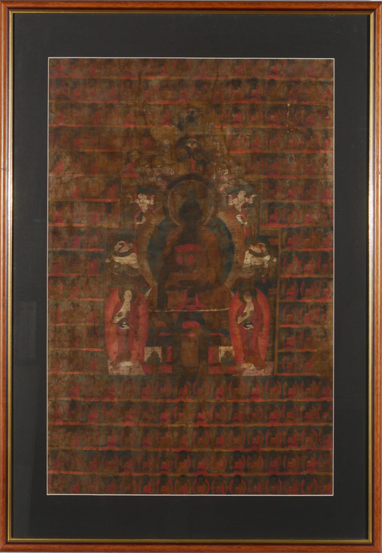 EARLY TIBETAN THANGKA PAINTING: Oil/Canvas laid down, Depicts a Single Deity Surrounded by Many Smaller Figures, Sight size 28 1/4'' x 18 3/4'', framed 36'' x 25 1/2''.