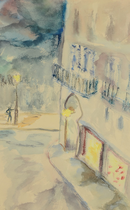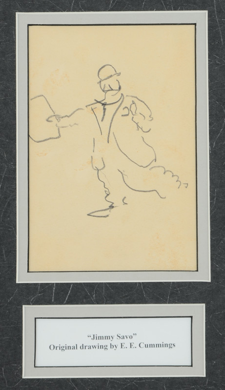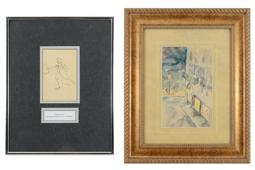 CUMMINGS, Edward Estlin, (American, 1894-1962): 2 pc lot of EE Cummings Artworks, 1) ''Jimmy Savo w/Newspaper'', Pencil Drawing, sight size 5 1/4'' x 3 1/2'', framed and matted with accompanying paperwork on back, 14 1/2'' x 11 1/2''. 2) ''Paris at Night'', Watercolor, sight size 9 1/8'' x 6'', framed and matted with accompanying paperwork on back, 18'' x 15''. From the William Crawford Plumley Estate.
